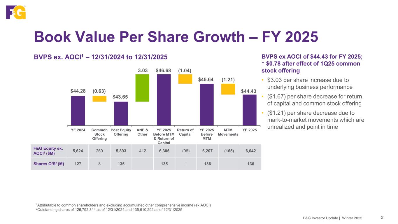 Our Stable and Strong Capital Profile 20F&G Investor Update | Winter 2025 1Excluding accumulated other comprehensive income (ex AOCI) Total Capitalization ex AOCI1 ($M) 5,223 5,093 5,749 6,155 250 250 1,100 1,760 2,195 2,270 6,323 6,853 8,194 8,675 YE 2022 YE 2023 YE 2024 YE 2025 Debt Preferred Stock Total Equity ex. AOCI Adj. Debt to Capital % 17.4% 25.7% 26.8% 26.2% Strong F&G capitalization; debt-to-capitalization ratio managed to long term target of 25% • In early 2025, completed common stock offering with net proceeds of $269M to support future growth and liquidity; net debt issued and redeemed of $75M • Balance sheet expected to naturally delever as a result of growth in total equity, excluding AOCI