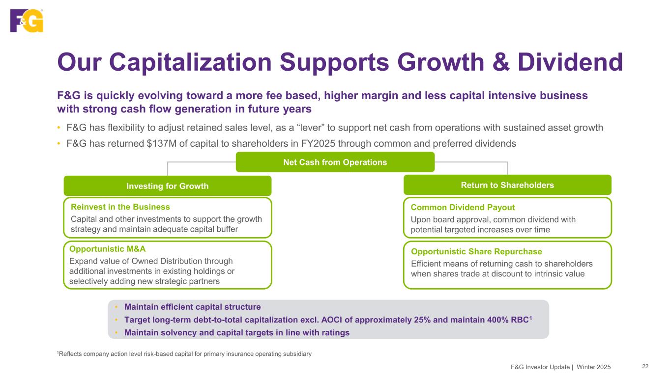 F&G Investor Update | Winter 2025 Book Value Per Share Growth – FY 2025 21 BVPS ex. AOCI1 – 12/31/2024 to 12/31/2025 1Attributable to common shareholders and excluding accumulated other comprehensive income (ex AOCI) 2Outstanding shares of 126,792,844 as of 12/31/2024 and 135,610,292 as of 12/31/2025 BVPS ex AOCI of $44.43 for FY 2025; ↑ $0.78 after effect of 1Q25 common stock offering • $3.03 per share increase due to underlying business performance • ($1.67) per share decrease for return of capital and common stock offering • ($1.21) per share decrease due to mark-to-market movements which are unrealized and point in time $44.28 $43.65 $46.68 $45.64 $44.43 (0.63) 3.03 (1.04) (1.21) $41.00 $42.00 $43.00 $44.00 $45.00 $46.00 $47.00 YE 2024 Common Stock Offering Post Equity Offering ANE & Other YE 2025 Before MTM & Return of Capital Return of Capital YE 2025 Before MTM MTM Movements YE 2025 F&G Equity ex. AOCI1 ($M) 5,624 269 5,893 412 6,305 (98) 6,207 (165) 6,042 Shares O/S2 (M) 127 8 135 135 1 136 136
