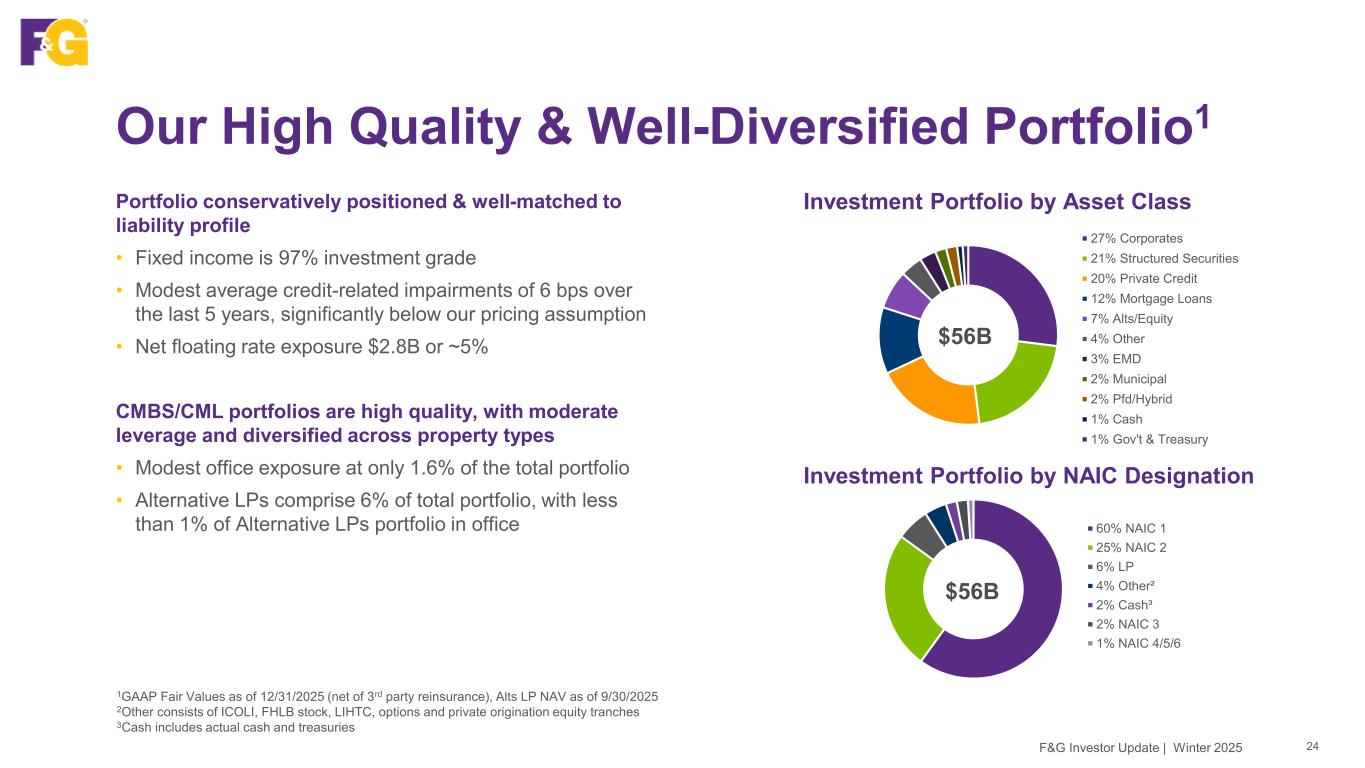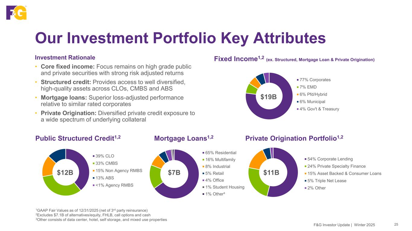 Our High Quality & Well-Diversified Portfolio1 24F&G Investor Update | Winter 2025 60% NAIC 1 25% NAIC 2 6% LP 4% Other² 2% Cash³ 2% NAIC 3 1% NAIC 4/5/6 $56B Investment Portfolio by Asset Class Investment Portfolio by NAIC Designation $56B Portfolio conservatively positioned & well-matched to liability profile • Fixed income is 97% investment grade • Modest average credit-related impairments of 6 bps over the last 5 years, significantly below our pricing assumption • Net floating rate exposure $2.8B or ~5% CMBS/CML portfolios are high quality, with moderate leverage and diversified across property types • Modest office exposure at only 1.6% of the total portfolio • Alternative LPs comprise 6% of total portfolio, with less than 1% of Alternative LPs portfolio in office 1GAAP Fair Values as of 12/31/2025 (net of 3rd party reinsurance), Alts LP NAV as of 9/30/2025 2Other consists of ICOLI, FHLB stock, LIHTC, options and private origination equity tranches 3Cash includes actual cash and treasuries 27% Corporates 21% Structured Securities 20% Private Credit 12% Mortgage Loans 7% Alts/Equity 4% Other 3% EMD 2% Municipal 2% Pfd/Hybrid 1% Cash 1% Gov't & Treasury