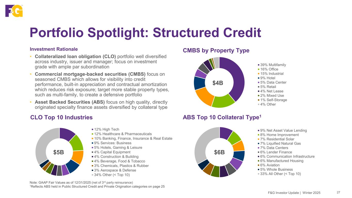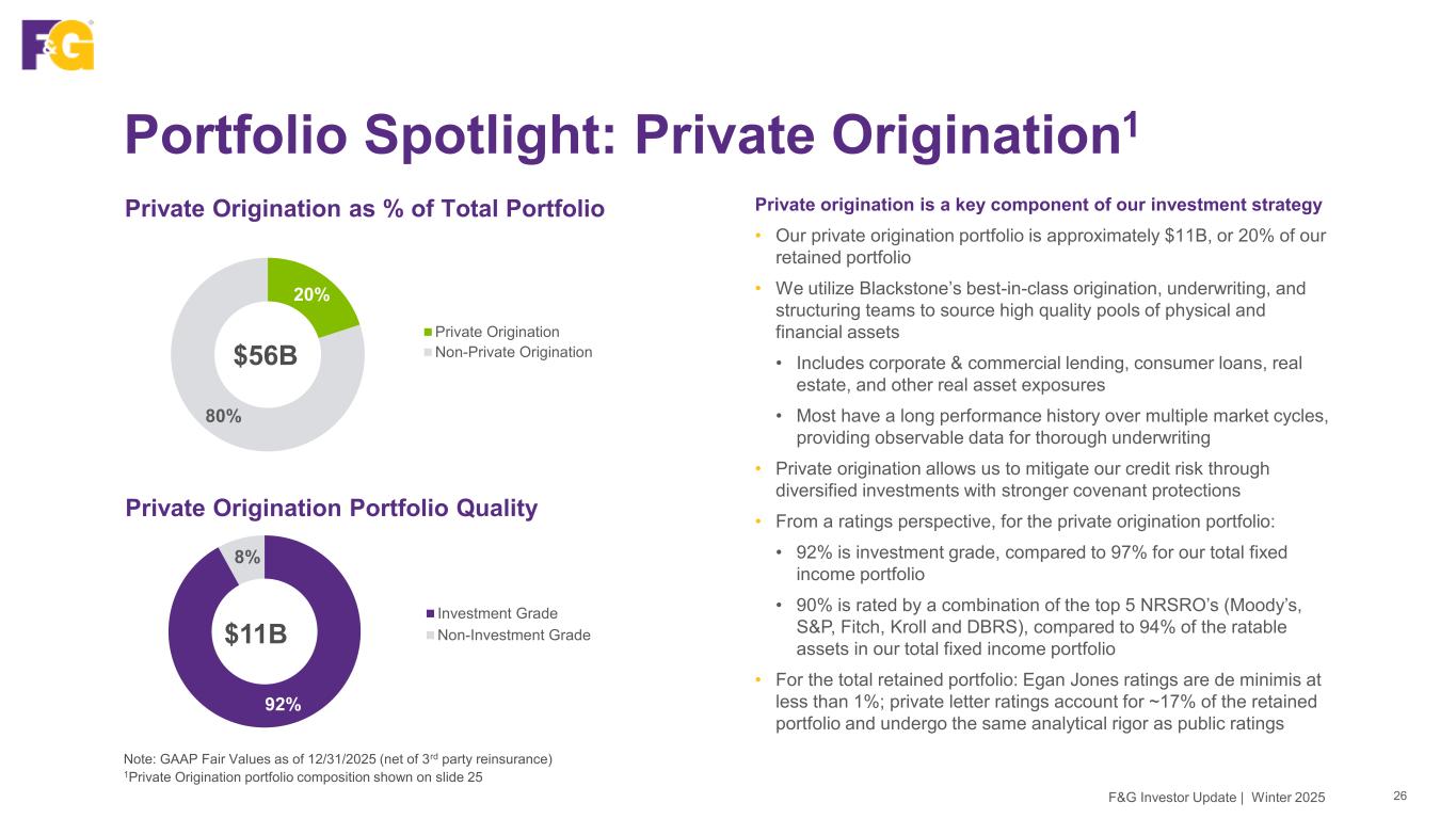 54% Corporate Lending 24% Private Specialty Finance 15% Asset Backed & Consumer Loans 5% Triple Net Lease 2% Other 77% Corporates 7% EMD 6% Pfd/Hybrid 6% Municipal 4% Gov't & Treasury 39% CLO 33% CMBS 15% Non Agency RMBS 13% ABS <1% Agency RMBS Our Investment Portfolio Key Attributes Investment Rationale • Core fixed income: Focus remains on high grade public and private securities with strong risk adjusted returns • Structured credit: Provides access to well diversified, high-quality assets across CLOs, CMBS and ABS • Mortgage loans: Superior loss-adjusted performance relative to similar rated corporates • Private Origination: Diversified private credit exposure to a wide spectrum of underlying collateral Fixed Income1,2 (ex. Structured, Mortgage Loan & Private Origination) 1GAAP Fair Values as of 12/31/2025 (net of 3rd party reinsurance) 2Excludes $7.1B of alternatives/equity, FHLB, call options and cash 3Other consists of data center, hotel, self storage, and mixed use properties Public Structured Credit1,2 65% Residential 16% Multifamily 8% Industrial 5% Retail 4% Office 1% Student Housing 1% Other³ Private Origination Portfolio1,2 $19B $12B Mortgage Loans1,2 $7B $11B 25F&G Investor Update | Winter 2025