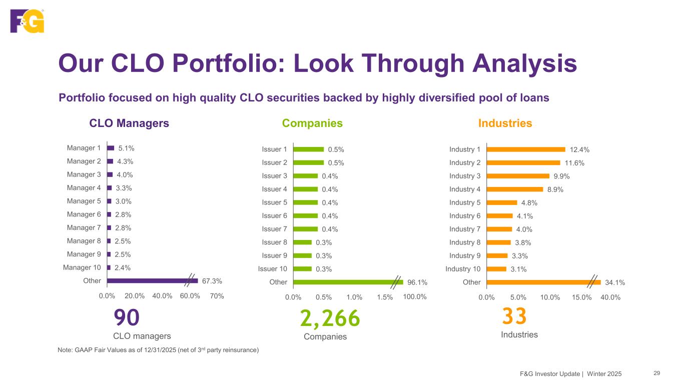 Our CLO Portfolio: Look Through Analysis 29 Portfolio focused on high quality CLO securities backed by highly diversified pool of loans Note: GAAP Fair Values as of 12/31/2025 (net of 3rd party reinsurance) IndustriesCompaniesCLO Managers 90 CLO managers 2,266 Companies 33 Industries 5.1% 4.3% 4.0% 3.3% 3.0% 2.8% 2.8% 2.5% 2.5% 2.4% 67.3% 0.0% 20.0% 40.0% 60.0% 80.0% Manager 1 Manager 2 Manager 3 Manager 4 Manager 5 Manager 6 Manager 7 Manager 8 Manager 9 Manager 10 Other 70% 0.5% 0.5% 0.4% 0.4% 0.4% 0.4% 0.4% 0.3% 0.3% 0.3% 96.1% 0.0% 0.5% 1.0% 1.5% 2.0% Issuer 1 Issuer 2 Issuer 3 Issuer 4 Issuer 5 Issuer 6 Issuer 7 Issuer 8 Issuer 9 Issuer 10 Other 100.0% 12.4% 11.6% 9.9% 8.9% 4.8% 4.1% 4.0% 3.8% 3.3% 3.1% 34.1% 0.0% 5.0% 10.0% 15.0% 20.0% Industry 1 Industry 2 Industry 3 Industry 4 Industry 5 Industry 6 Industry 7 Industry 8 Industry 9 Industry 10 Other 40.0% F&G Investor Update | Winter 2025