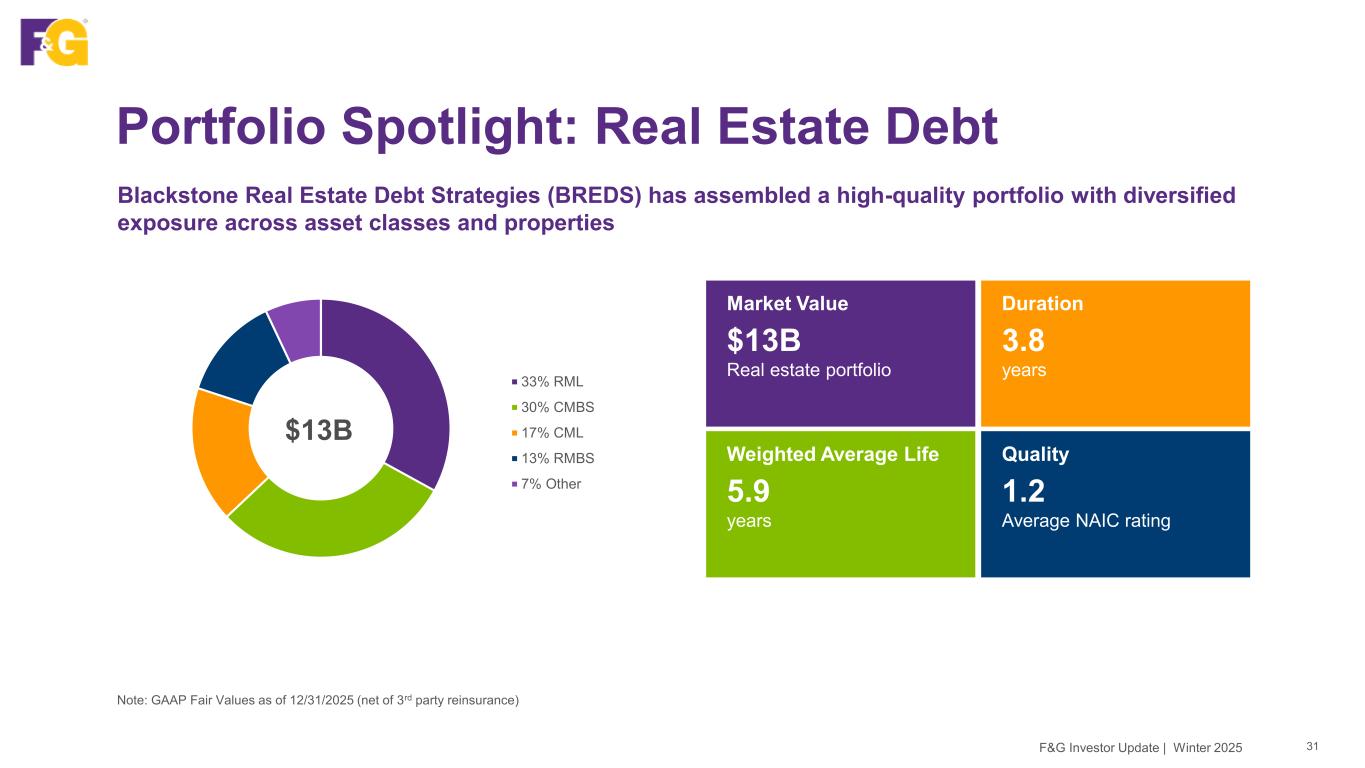 U.S. CLO Impairment Frontier 30 CLO debt is well insulated from higher defaults and lower recovery rates • BBB CLOs can withstand an annualized default of 9.1% (that would have to occur every year) assuming a 62.3% average long- term loan recovery rate U.S. CLO Impairment Frontier (First-Loss Scenarios among CLO tranches) Note: Reflects Blackstone’s views and beliefs as of December 31, 2025. Source: US J.P. Morgan as of December 31, 2025 for average recovery rate and annual loan default rate; CLO impairment frontiers generated from Intex model and include key assumptions as follows: Interest rates based on current Intex curve, annual prepayment rate of 20%, Recovery lag = 12 months, CLO redeemed at AAA payoff date in standard CLO run, reinvestment price = 99.75, reinvestment rate = 3 month SOFR + 325bps, no reinvestment post Reinvestment Period. Please note: the historical data point shown is calculated using annual default and recovery rates from J.P. Morgan Leveraged Loan Index and represents the average default rates and weighted average recovery rates from 1998-2025 for the long-term average time period. Average recovery rate is representative of first-lien loans as of December 31, 2025 0% 5% 10% 15% 20% 30%40%50%60%70% A n n u a l D e fa u lt R a te Average Senior Loan Recovery Rate A BBB BB Long-Term Average Annual Default Rate F&G Investor Update | Winter 2025