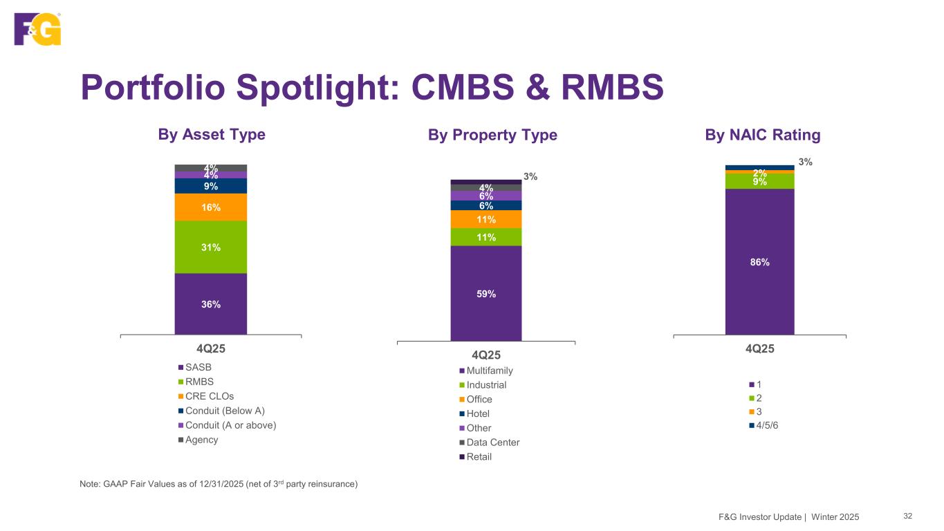 Portfolio Spotlight: Real Estate Debt 31 Blackstone Real Estate Debt Strategies (BREDS) has assembled a high-quality portfolio with diversified exposure across asset classes and properties Note: GAAP Fair Values as of 12/31/2025 (net of 3rd party reinsurance) 33% RML 30% CMBS 17% CML 13% RMBS 7% Other $13B Duration 3.8 years Quality 1.2 Average NAIC rating Market Value $13B Real estate portfolio Weighted Average Life 5.9 years F&G Investor Update | Winter 2025