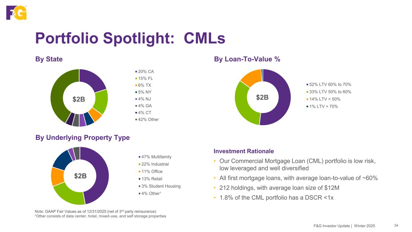 Portfolio Spotlight: CMBS 33 Prudent asset selection has led to more multifamily exposure and less retail vs. Conduit CMBS market averages Portfolio Construction Comparison1 Note: GAAP Fair Values as of 12/31/2025 (net of 3rd party reinsurance) 1BAML Conduit Data as of 12/31/2025 39% 5% 14% 24% Multifamily Retail F&G Post-Crisis Conduit CMBS Credit Quality 86% Investment grade (NRSRO) Quality 1.3 Average NAIC rating Market Value $4B CMBS portfolio Credit focus A- NRSRO rating F&G Investor Update | Winter 2025