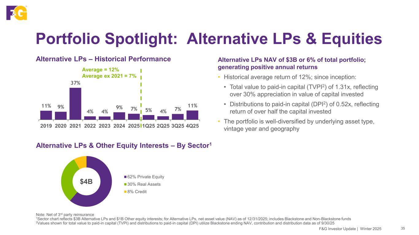 Portfolio Spotlight: CMLs 34 Investment Rationale • Our Commercial Mortgage Loan (CML) portfolio is low risk, low leveraged and well diversified • All first mortgage loans, with average loan-to-value of ~60% • 212 holdings, with average loan size of $12M • 1.8% of the CML portfolio has a DSCR <1x By State By Loan-To-Value % By Underlying Property Type Note: GAAP Fair Values as of 12/31/2025 (net of 3rd party reinsurance) ¹Other consists of data center, hotel, mixed-use, and self storage properties 20% CA 15% FL 6% TX 5% NY 4% NJ 4% GA 4% CT 42% Other $2B 52% LTV 60% to 70% 33% LTV 50% to 60% 14% LTV < 50% 1% LTV > 70% $2B $2B 47% Multifamily 22% Industrial 11% Office 13% Retail 3% Student Housing 4% Other¹ F&G Investor Update | Winter 2025