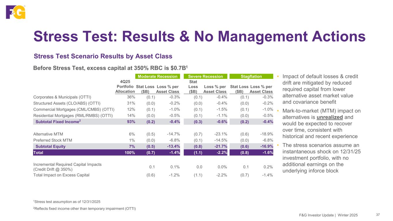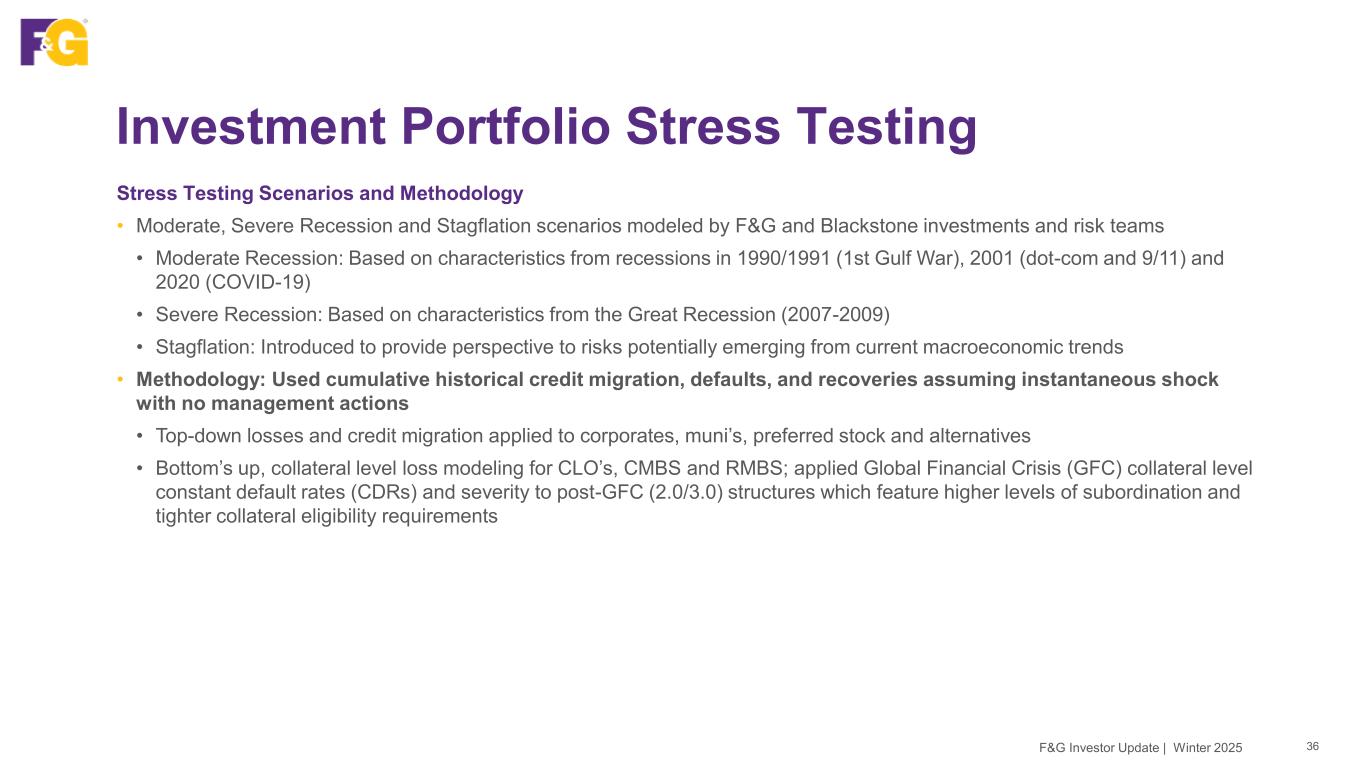 Investment Portfolio Stress Testing 36F&G Investor Update | Winter 2025 Stress Testing Scenarios and Methodology • Moderate, Severe Recession and Stagflation scenarios modeled by F&G and Blackstone investments and risk teams • Moderate Recession: Based on characteristics from recessions in 1990/1991 (1st Gulf War), 2001 (dot-com and 9/11) and 2020 (COVID-19) • Severe Recession: Based on characteristics from the Great Recession (2007-2009) • Stagflation: Introduced to provide perspective to risks potentially emerging from current macroeconomic trends • Methodology: Used cumulative historical credit migration, defaults, and recoveries assuming instantaneous shock with no management actions • Top-down losses and credit migration applied to corporates, muni’s, preferred stock and alternatives • Bottom’s up, collateral level loss modeling for CLO’s, CMBS and RMBS; applied Global Financial Crisis (GFC) collateral level constant default rates (CDRs) and severity to post-GFC (2.0/3.0) structures which feature higher levels of subordination and tighter collateral eligibility requirements