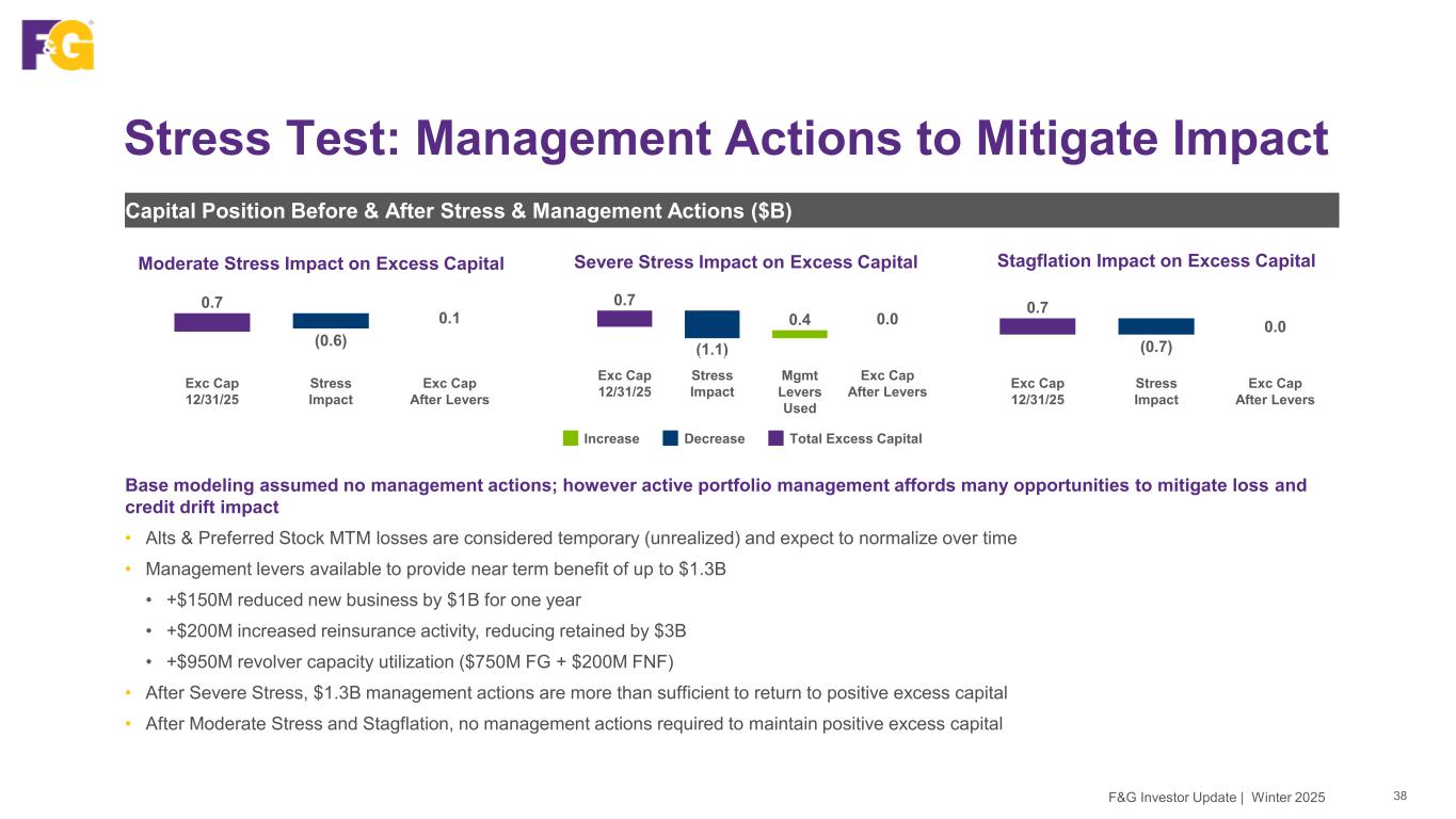 Stress Test: Results & No Management Actions 37F&G Investor Update | Winter 2025 Stress Test Scenario Results by Asset Class 1Stress test assumption as of 12/31/2025 2Reflects fixed income other than temporary impairment (OTTI) Before Stress Test, excess capital at 350% RBC is $0.7B1 Moderate Recession Severe Recession Stagflation 4Q25 Portfolio Allocation Stat Loss ($B) Loss % per Asset Class Stat Loss ($B) Loss % per Asset Class Stat Loss ($B) Loss % per Asset Class Corporates & Municipals (OTTI) 36% (0.1) -0.3% (0.1) -0.4% (0.1) -0.3% Structured Assets (CLO/ABS) (OTTI) 31% (0.0) -0.2% (0.0) -0.4% (0.0) -0.2% Commercial Mortgages (CML/CMBS) (OTTI) 12% (0.1) -1.0% (0.1) -1.5% (0.1) -1.0% Residential Mortgages (RML/RMBS) (OTTI) 14% (0.0) -0.5% (0.1) -1.1% (0.0) -0.5% Subtotal Fixed Income2 93% (0.2) -0.4% (0.3) -0.6% (0.2) -0.4% Alternative MTM 6% (0.5) -14.7% (0.7) -23.1% (0.6) -18.9% Preferred Stock MTM 1% (0.0) -6.8% (0.1) -14.5% (0.0) -6.8% Subtotal Equity 7% (0.5) -13.4% (0.8) -21.7% (0.6) -16.9% Total 100% (0.7) -1.4% (1.1) -2.2% (0.8) -1.6% Incremental Required Capital Impacts (Credit Drift @ 350%) 0.1 0.1% 0.0 0.0% 0.1 0.2% Total Impact on Excess Capital (0.6) -1.2% (1.1) -2.2% (0.7) -1.4% • Impact of default losses & credit drift are mitigated by reduced required capital from lower alternative asset market value and covariance benefit • Mark-to-market (MTM) impact on alternatives is unrealized and would be expected to recover over time, consistent with historical and recent experience • The stress scenarios assume an instantaneous shock on 12/31/25 investment portfolio, with no additional earnings on the underlying inforce block