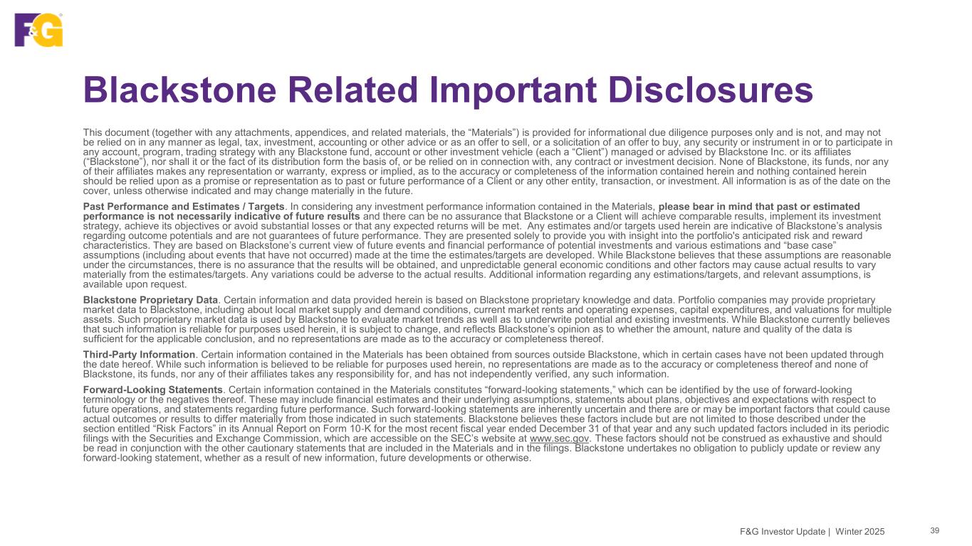 Blackstone Related Important Disclosures 39 This document (together with any attachments, appendices, and related materials, the “Materials”) is provided for informational due diligence purposes only and is not, and may not be relied on in any manner as legal, tax, investment, accounting or other advice or as an offer to sell, or a solicitation of an offer to buy, any security or instrument in or to participate in any account, program, trading strategy with any Blackstone fund, account or other investment vehicle (each a “Client”) managed or advised by Blackstone Inc. or its affiliates (“Blackstone”), nor shall it or the fact of its distribution form the basis of, or be relied on in connection with, any contract or investment decision. None of Blackstone, its funds, nor any of their affiliates makes any representation or warranty, express or implied, as to the accuracy or completeness of the information contained herein and nothing contained herein should be relied upon as a promise or representation as to past or future performance of a Client or any other entity, transaction, or investment. All information is as of the date on the cover, unless otherwise indicated and may change materially in the future. Past Performance and Estimates / Targets. In considering any investment performance information contained in the Materials, please bear in mind that past or estimated performance is not necessarily indicative of future results and there can be no assurance that Blackstone or a Client will achieve comparable results, implement its investment strategy, achieve its objectives or avoid substantial losses or that any expected returns will be met. Any estimates and/or targets used herein are indicative of Blackstone’s analysis regarding outcome potentials and are not guarantees of future performance. They are presented solely to provide you with insight into the portfolio's anticipated risk and reward characteristics. They are based on Blackstone’s current view of future events and financial performance of potential investments and various estimations and “base case” assumptions (including about events that have not occurred) made at the time the estimates/targets are developed. While Blackstone believes that these assumptions are reasonable under the circumstances, there is no assurance that the results will be obtained, and unpredictable general economic conditions and other factors may cause actual results to vary materially from the estimates/targets. Any variations could be adverse to the actual results. Additional information regarding any estimations/targets, and relevant assumptions, is available upon request. Blackstone Proprietary Data. Certain information and data provided herein is based on Blackstone proprietary knowledge and data. Portfolio companies may provide proprietary market data to Blackstone, including about local market supply and demand conditions, current market rents and operating expenses, capital expenditures, and valuations for multiple assets. Such proprietary market data is used by Blackstone to evaluate market trends as well as to underwrite potential and existing investments. While Blackstone currently believes that such information is reliable for purposes used herein, it is subject to change, and reflects Blackstone’s opinion as to whether the amount, nature and quality of the data is sufficient for the applicable conclusion, and no representations are made as to the accuracy or completeness thereof. Third-Party Information. Certain information contained in the Materials has been obtained from sources outside Blackstone, which in certain cases have not been updated through the date hereof. While such information is believed to be reliable for purposes used herein, no representations are made as to the accuracy or completeness thereof and none of Blackstone, its funds, nor any of their affiliates takes any responsibility for, and has not independently verified, any such information. Forward-Looking Statements. Certain information contained in the Materials constitutes “forward-looking statements,” which can be identified by the use of forward-looking terminology or the negatives thereof. These may include financial estimates and their underlying assumptions, statements about plans, objectives and expectations with respect to future operations, and statements regarding future performance. Such forward‐looking statements are inherently uncertain and there are or may be important factors that could cause actual outcomes or results to differ materially from those indicated in such statements. Blackstone believes these factors include but are not limited to those described under the section entitled “Risk Factors” in its Annual Report on Form 10‐K for the most recent fiscal year ended December 31 of that year and any such updated factors included in its periodic filings with the Securities and Exchange Commission, which are accessible on the SEC’s website at www.sec.gov. These factors should not be construed as exhaustive and should be read in conjunction with the other cautionary statements that are included in the Materials and in the filings. Blackstone undertakes no obligation to publicly update or review any forward‐looking statement, whether as a result of new information, future developments or otherwise. F&G Investor Update | Winter 2025