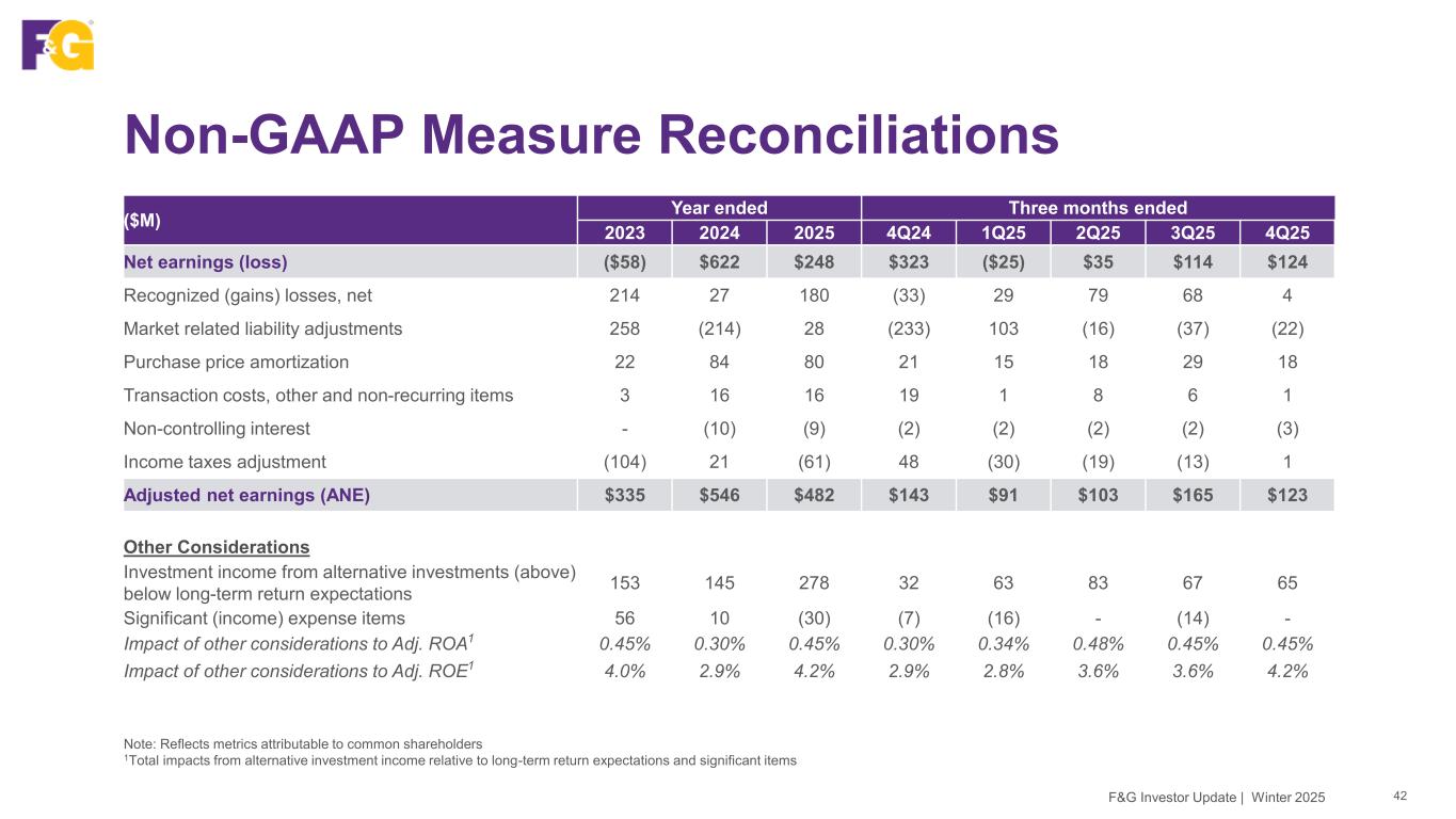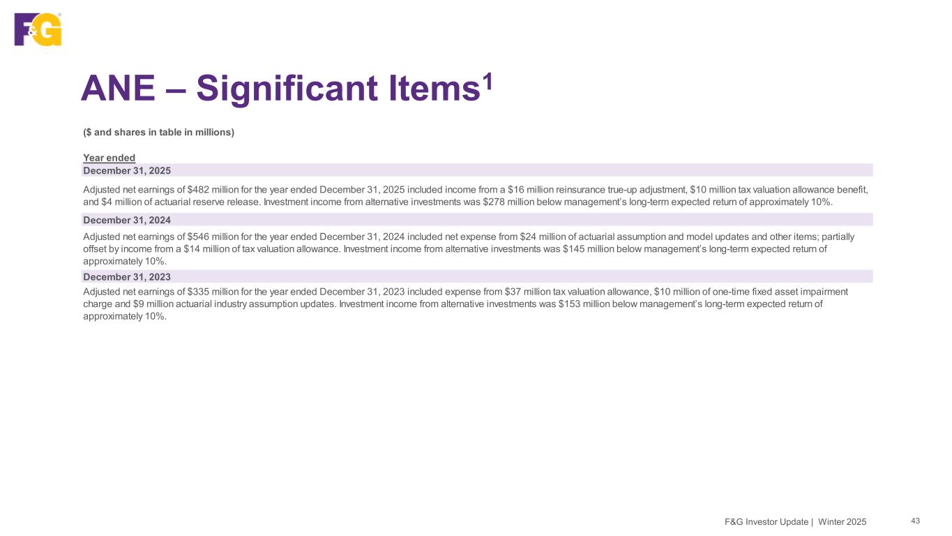 Non-GAAP Measure Reconciliations 42F&G Investor Update | Winter 2025 Note: Reflects metrics attributable to common shareholders 1Total impacts from alternative investment income relative to long-term return expectations and significant items ($M) Year ended Three months ended 2023 2024 2025 4Q24 1Q25 2Q25 3Q25 4Q25 Net earnings (loss) ($58) $622 $248 $323 ($25) $35 $114 $124 Recognized (gains) losses, net 214 27 180 (33) 29 79 68 4 Market related liability adjustments 258 (214) 28 (233) 103 (16) (37) (22) Purchase price amortization 22 84 80 21 15 18 29 18 Transaction costs, other and non-recurring items 3 16 16 19 1 8 6 1 Non-controlling interest - (10) (9) (2) (2) (2) (2) (3) Income taxes adjustment (104) 21 (61) 48 (30) (19) (13) 1 Adjusted net earnings (ANE) $335 $546 $482 $143 $91 $103 $165 $123 Other Considerations Investment income from alternative investments (above) below long-term return expectations 153 145 278 32 63 83 67 65 Significant (income) expense items 56 10 (30) (7) (16) - (14) - Impact of other considerations to Adj. ROA1 0.45% 0.30% 0.45% 0.30% 0.34% 0.48% 0.45% 0.45% Impact of other considerations to Adj. ROE1 4.0% 2.9% 4.2% 2.9% 2.8% 3.6% 3.6% 4.2%