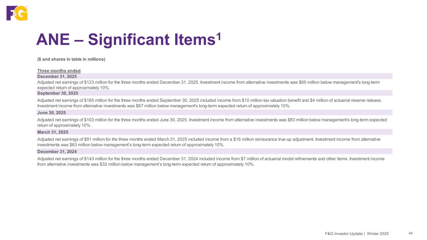 ANE – Significant Items1 43F&G Investor Update | Winter 2025 ($ and shares in table in millions) Year ended December 31, 2025 Adjusted net earnings of $482 million for the year ended December 31, 2025 included income from a $16 million reinsurance true-up adjustment, $10 million tax valuation allowance benefit, and $4 million of actuarial reserve release. Investment income from alternative investments was $278 million below management’s long-term expected return of approximately 10%. December 31, 2024 Adjusted net earnings of $546 million for the year ended December 31, 2024 included net expense from $24 million of actuarial assumption and model updates and other items; partially offset by income from a $14 million of tax valuation allowance. Investment income from alternative investments was $145 million below management’s long-term expected return of approximately 10%. December 31, 2023 Adjusted net earnings of $335 million for the year ended December 31, 2023 included expense from $37 million tax valuation allowance, $10 million of one-time fixed asset impairment charge and $9 million actuarial industry assumption updates. Investment income from alternative investments was $153 million below management’s long-term expected return of approximately 10%.