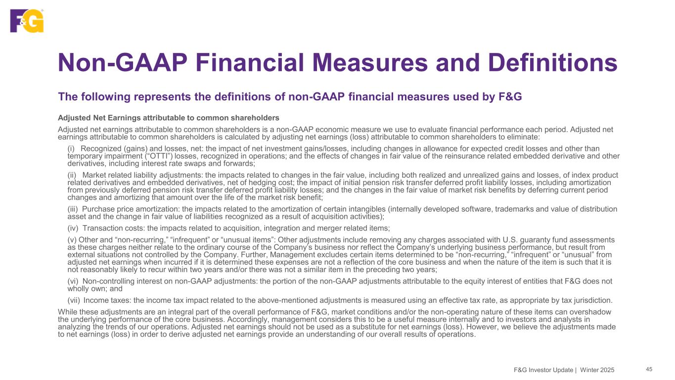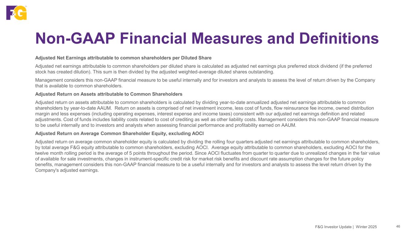 Non-GAAP Financial Measures and Definitions 45F&G Investor Update | Winter 2025 The following represents the definitions of non-GAAP financial measures used by F&G Adjusted Net Earnings attributable to common shareholders Adjusted net earnings attributable to common shareholders is a non-GAAP economic measure we use to evaluate financial performance each period. Adjusted net earnings attributable to common shareholders is calculated by adjusting net earnings (loss) attributable to common shareholders to eliminate: (i) Recognized (gains) and losses, net: the impact of net investment gains/losses, including changes in allowance for expected credit losses and other than temporary impairment (“OTTI”) losses, recognized in operations; and the effects of changes in fair value of the reinsurance related embedded derivative and other derivatives, including interest rate swaps and forwards; (ii) Market related liability adjustments: the impacts related to changes in the fair value, including both realized and unrealized gains and losses, of index product related derivatives and embedded derivatives, net of hedging cost; the impact of initial pension risk transfer deferred profit liability losses, including amortization from previously deferred pension risk transfer deferred profit liability losses; and the changes in the fair value of market risk benefits by deferring current period changes and amortizing that amount over the life of the market risk benefit; (iii) Purchase price amortization: the impacts related to the amortization of certain intangibles (internally developed software, trademarks and value of distribution asset and the change in fair value of liabilities recognized as a result of acquisition activities); (iv) Transaction costs: the impacts related to acquisition, integration and merger related items; (v) Other and “non-recurring,” “infrequent” or “unusual items”: Other adjustments include removing any charges associated with U.S. guaranty fund assessments as these charges neither relate to the ordinary course of the Company’s business nor reflect the Company’s underlying business performance, but result from external situations not controlled by the Company. Further, Management excludes certain items determined to be “non-recurring,” “infrequent” or “unusual” from adjusted net earnings when incurred if it is determined these expenses are not a reflection of the core business and when the nature of the item is such that it is not reasonably likely to recur within two years and/or there was not a similar item in the preceding two years; (vi) Non-controlling interest on non-GAAP adjustments: the portion of the non-GAAP adjustments attributable to the equity interest of entities that F&G does not wholly own; and (vii) Income taxes: the income tax impact related to the above-mentioned adjustments is measured using an effective tax rate, as appropriate by tax jurisdiction. While these adjustments are an integral part of the overall performance of F&G, market conditions and/or the non-operating nature of these items can overshadow the underlying performance of the core business. Accordingly, management considers this to be a useful measure internally and to investors and analysts in analyzing the trends of our operations. Adjusted net earnings should not be used as a substitute for net earnings (loss). However, we believe the adjustments made to net earnings (loss) in order to derive adjusted net earnings provide an understanding of our overall results of operations.