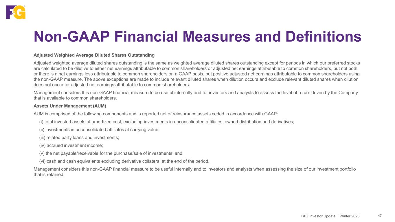Non-GAAP Financial Measures and Definitions 46F&G Investor Update | Winter 2025 Adjusted Net Earnings attributable to common shareholders per Diluted Share Adjusted net earnings attributable to common shareholders per diluted share is calculated as adjusted net earnings plus preferred stock dividend (if the preferred stock has created dilution). This sum is then divided by the adjusted weighted-average diluted shares outstanding. Management considers this non-GAAP financial measure to be useful internally and for investors and analysts to assess the level of return driven by the Company that is available to common shareholders. Adjusted Return on Assets attributable to Common Shareholders Adjusted return on assets attributable to common shareholders is calculated by dividing year-to-date annualized adjusted net earnings attributable to common shareholders by year-to-date AAUM. Return on assets is comprised of net investment income, less cost of funds, flow reinsurance fee income, owned distribution margin and less expenses (including operating expenses, interest expense and income taxes) consistent with our adjusted net earnings definition and related adjustments. Cost of funds includes liability costs related to cost of crediting as well as other liability costs. Management considers this non-GAAP financial measure to be useful internally and to investors and analysts when assessing financial performance and profitability earned on AAUM. Adjusted Return on Average Common Shareholder Equity, excluding AOCI Adjusted return on average common shareholder equity is calculated by dividing the rolling four quarters adjusted net earnings attributable to common shareholders, by total average F&G equity attributable to common shareholders, excluding AOCI. Average equity attributable to common shareholders, excluding AOCI for the twelve month rolling period is the average of 5 points throughout the period. Since AOCI fluctuates from quarter to quarter due to unrealized changes in the fair value of available for sale investments, changes in instrument-specific credit risk for market risk benefits and discount rate assumption changes for the future policy benefits, management considers this non-GAAP financial measure to be a useful internally and for investors and analysts to assess the level return driven by the Company's adjusted earnings.