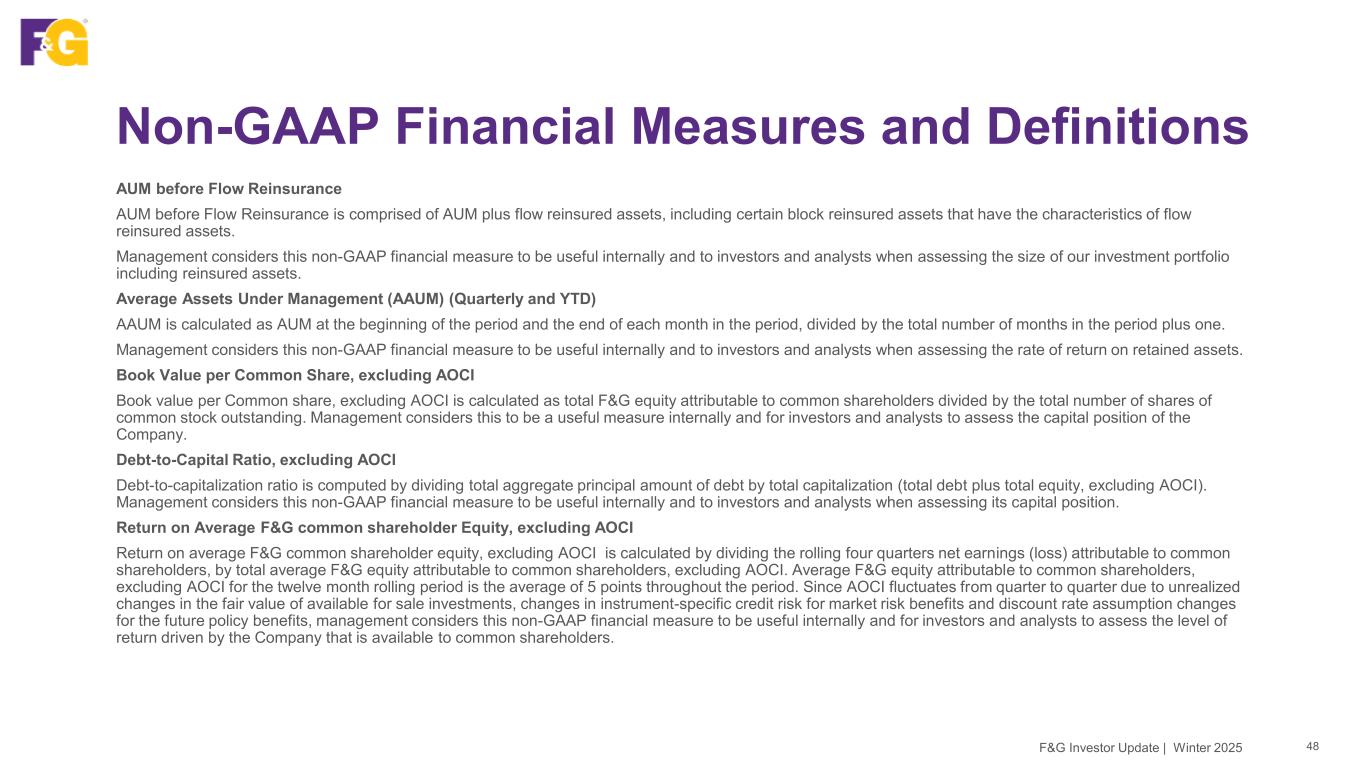 Non-GAAP Financial Measures and Definitions 47F&G Investor Update | Winter 2025 Adjusted Weighted Average Diluted Shares Outstanding Adjusted weighted average diluted shares outstanding is the same as weighted average diluted shares outstanding except for periods in which our preferred stocks are calculated to be dilutive to either net earnings attributable to common shareholders or adjusted net earnings attributable to common shareholders, but not both, or there is a net earnings loss attributable to common shareholders on a GAAP basis, but positive adjusted net earnings attributable to common shareholders using the non-GAAP measure. The above exceptions are made to include relevant diluted shares when dilution occurs and exclude relevant diluted shares when dilution does not occur for adjusted net earnings attributable to common shareholders. Management considers this non-GAAP financial measure to be useful internally and for investors and analysts to assess the level of return driven by the Company that is available to common shareholders. Assets Under Management (AUM) AUM is comprised of the following components and is reported net of reinsurance assets ceded in accordance with GAAP: (i) total invested assets at amortized cost, excluding investments in unconsolidated affiliates, owned distribution and derivatives; (ii) investments in unconsolidated affiliates at carrying value; (iii) related party loans and investments; (iv) accrued investment income; (v) the net payable/receivable for the purchase/sale of investments; and (vi) cash and cash equivalents excluding derivative collateral at the end of the period. Management considers this non-GAAP financial measure to be useful internally and to investors and analysts when assessing the size of our investment portfolio that is retained.