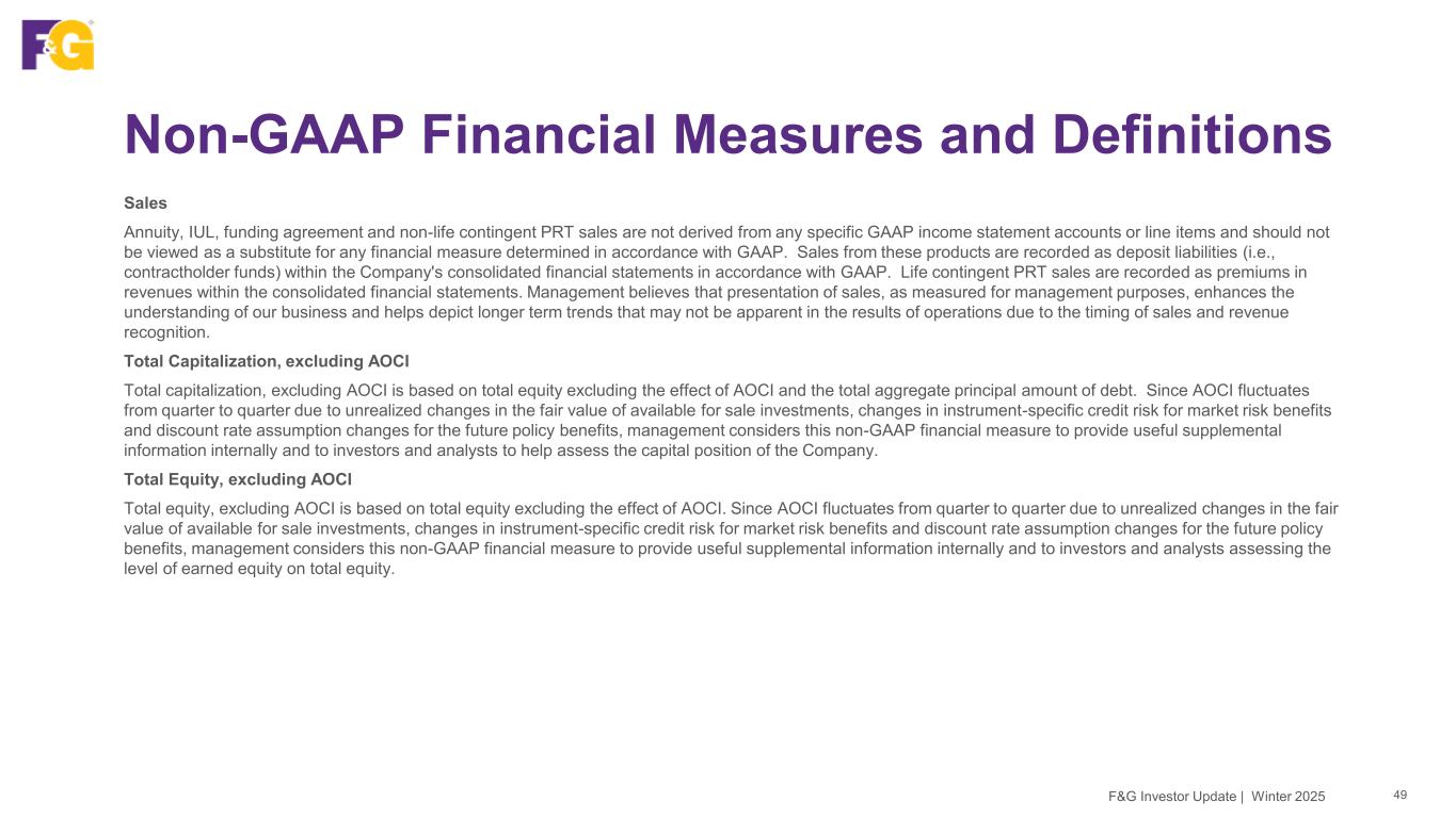 Non-GAAP Financial Measures and Definitions 48F&G Investor Update | Winter 2025 AUM before Flow Reinsurance AUM before Flow Reinsurance is comprised of AUM plus flow reinsured assets, including certain block reinsured assets that have the characteristics of flow reinsured assets. Management considers this non-GAAP financial measure to be useful internally and to investors and analysts when assessing the size of our investment portfolio including reinsured assets. Average Assets Under Management (AAUM) (Quarterly and YTD) AAUM is calculated as AUM at the beginning of the period and the end of each month in the period, divided by the total number of months in the period plus one. Management considers this non-GAAP financial measure to be useful internally and to investors and analysts when assessing the rate of return on retained assets. Book Value per Common Share, excluding AOCI Book value per Common share, excluding AOCI is calculated as total F&G equity attributable to common shareholders divided by the total number of shares of common stock outstanding. Management considers this to be a useful measure internally and for investors and analysts to assess the capital position of the Company. Debt-to-Capital Ratio, excluding AOCI Debt-to-capitalization ratio is computed by dividing total aggregate principal amount of debt by total capitalization (total debt plus total equity, excluding AOCI). Management considers this non-GAAP financial measure to be useful internally and to investors and analysts when assessing its capital position. Return on Average F&G common shareholder Equity, excluding AOCI Return on average F&G common shareholder equity, excluding AOCI is calculated by dividing the rolling four quarters net earnings (loss) attributable to common shareholders, by total average F&G equity attributable to common shareholders, excluding AOCI. Average F&G equity attributable to common shareholders, excluding AOCI for the twelve month rolling period is the average of 5 points throughout the period. Since AOCI fluctuates from quarter to quarter due to unrealized changes in the fair value of available for sale investments, changes in instrument-specific credit risk for market risk benefits and discount rate assumption changes for the future policy benefits, management considers this non-GAAP financial measure to be useful internally and for investors and analysts to assess the level of return driven by the Company that is available to common shareholders.