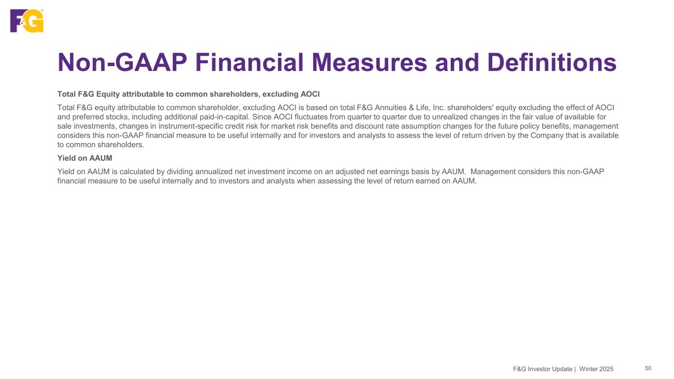 Non-GAAP Financial Measures and Definitions 49F&G Investor Update | Winter 2025 Sales Annuity, IUL, funding agreement and non-life contingent PRT sales are not derived from any specific GAAP income statement accounts or line items and should not be viewed as a substitute for any financial measure determined in accordance with GAAP. Sales from these products are recorded as deposit liabilities (i.e., contractholder funds) within the Company's consolidated financial statements in accordance with GAAP. Life contingent PRT sales are recorded as premiums in revenues within the consolidated financial statements. Management believes that presentation of sales, as measured for management purposes, enhances the understanding of our business and helps depict longer term trends that may not be apparent in the results of operations due to the timing of sales and revenue recognition. Total Capitalization, excluding AOCI Total capitalization, excluding AOCI is based on total equity excluding the effect of AOCI and the total aggregate principal amount of debt. Since AOCI fluctuates from quarter to quarter due to unrealized changes in the fair value of available for sale investments, changes in instrument-specific credit risk for market risk benefits and discount rate assumption changes for the future policy benefits, management considers this non-GAAP financial measure to provide useful supplemental information internally and to investors and analysts to help assess the capital position of the Company. Total Equity, excluding AOCI Total equity, excluding AOCI is based on total equity excluding the effect of AOCI. Since AOCI fluctuates from quarter to quarter due to unrealized changes in the fair value of available for sale investments, changes in instrument-specific credit risk for market risk benefits and discount rate assumption changes for the future policy benefits, management considers this non-GAAP financial measure to provide useful supplemental information internally and to investors and analysts assessing the level of earned equity on total equity.