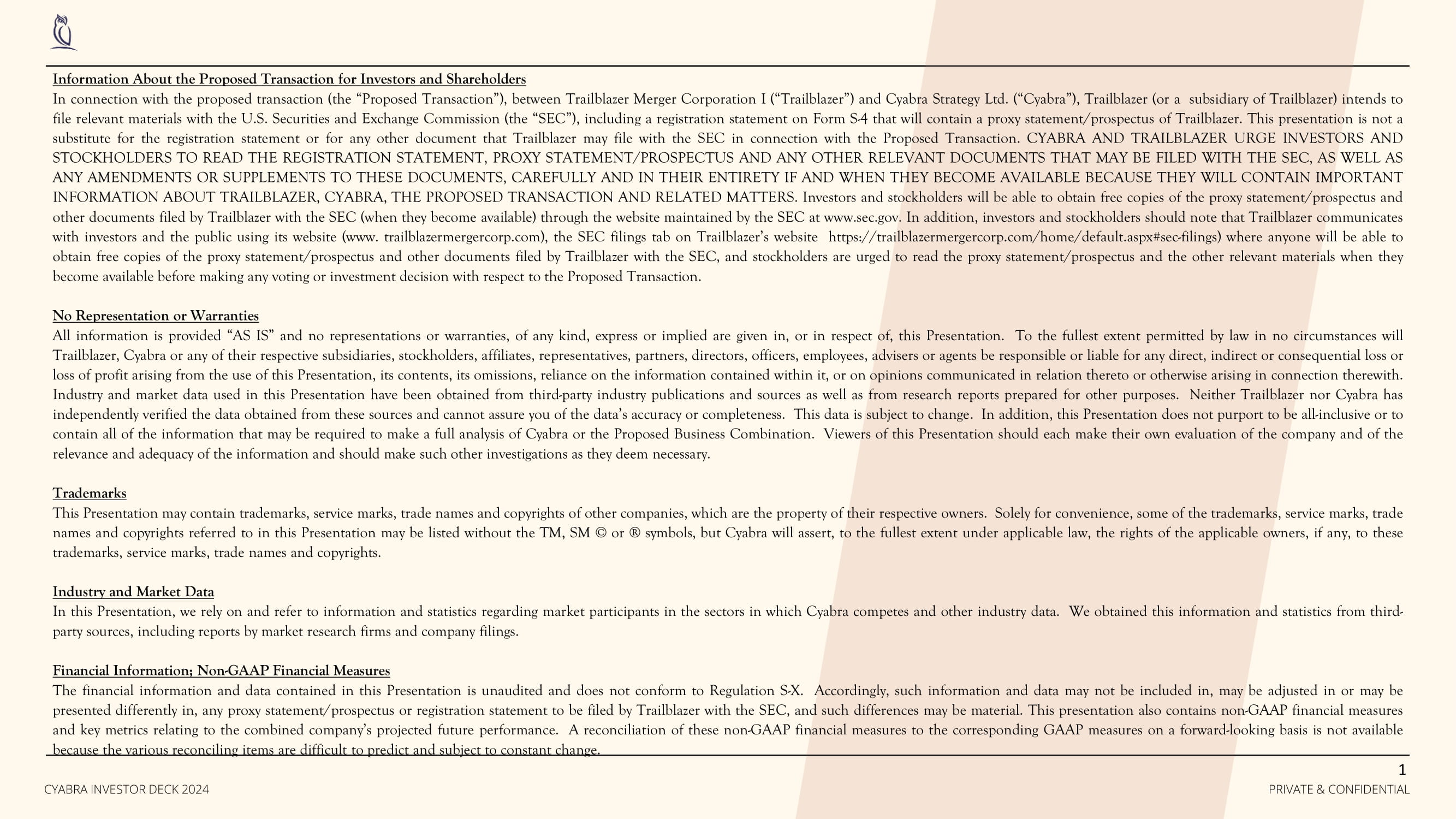 Information About the Proposed Transaction for Investors and Shareholders In connection with the proposed transaction (the “Proposed Transaction”), between Trailblazer Merger Corporation I (“Trailblazer”) and Cyabra Strategy Ltd . (“Cyabra”), Trailblazer (or a subsidiary of Trailblazer) intends to file relevant materials with the U . S . Securities and Exchange Commission (the “SEC”), including a registration statement on Form S - 4 that will contain a proxy statement/prospectus of Trailblazer . This presentation is not a substitute for the registration statement or for any other document that Trailblazer may file with the SEC in connection with the Proposed Transaction . CYABRA AND TRAILBLAZER URGE INVESTORS AND STOCKHOLDERS TO READ THE REGISTRATION STATEMENT, PROXY STATEMENT/PROSPECTUS AND ANY OTHER RELEVANT DOCUMENTS THAT MAY BE FILED WITH THE SEC, AS WELL AS ANY AMENDMENTS OR SUPPLEMENTS TO THESE DOCUMENTS, CAREFULLY AND IN THEIR ENTIRETY IF AND WHEN THEY BECOME AVAILABLE BECAUSE THEY WILL CONTAIN IMPORTANT INFORMATION ABOUT TRAILBLAZER, CYABRA, THE PROPOSED TRANSACTION AND RELATED MATTERS . Investors and stockholders will be able to obtain free copies of the proxy statement/prospectus and other documents filed by Trailblazer with the SEC (when they become available) through the website maintained by the SEC at www . sec . gov . In addition, investors and stockholders should note that Trailblazer communicates with investors and the public using its website (www . trailblazermergercorp . com), the SEC filings tab on Trailblazer’s website https : //trailblazermergercorp . com/home/default . aspx#sec - filings) where anyone will be able to obtain free copies of the proxy statement/prospectus and other documents filed by Trailblazer with the SEC, and stockholders are urged to read the proxy statement/prospectus and the other relevant materials when they become available before making any voting or investment decision with respect to the Proposed Transaction . No Representation or Warranties All information is provided “AS IS” and no representations or warranties, of any kind, express or implied are given in, or in respect of, this Presentation . To the fullest extent permitted by law in no circumstances will Trailblazer, Cyabra or any of their respective subsidiaries, stockholders, affiliates, representatives, partners, directors, officers, employees, advisers or agents be responsible or liable for any direct, indirect or consequential loss or loss of profit arising from the use of this Presentation, its contents, its omissions, reliance on the information contained within it, or on opinions communicated in relation thereto or otherwise arising in connection therewith . Industry and market data used in this Presentation have been obtained from third - party industry publications and sources as well as from research reports prepared for other purposes . Neither Trailblazer nor Cyabra has independently verified the data obtained from these sources and cannot assure you of the data’s accuracy or completeness . This data is subject to change . In addition, this Presentation does not purport to be all - inclusive or to contain all of the information that may be required to make a full analysis of Cyabra or the Proposed Business Combination . Viewers of this Presentation should each make their own evaluation of the company and of the relevance and adequacy of the information and should make such other investigations as they deem necessary . Trademarks This Presentation may contain trademarks, service marks, trade names and copyrights of other companies, which are the property of their respective owners . Solely for convenience, some of the trademarks, service marks, trade names and copyrights referred to in this Presentation may be listed without the TM, SM © or ® symbols, but Cyabra will assert, to the fullest extent under applicable law, the rights of the applicable owners, if any, to these trademarks, service marks, trade names and copyrights . Industry and Market Data In this Presentation, we rely on and refer to information and statistics regarding market participants in the sectors in which Cyabra competes and other industry data. We obtained this information and statistics from third - party sources, including reports by market research firms and company filings. Financial Information ; Non - GAAP Financial Measures The financial information and data contained in this Presentation is unaudited and does not conform to Regulation S - X . Accordingly, such information and data may not be included in, may be adjusted in or may be presented differently in, any proxy statement/prospectus or registration statement to be filed by Trailblazer with the SEC, and such differences may be material . This presentation also contains non - GAAP financial measures and key metrics relating to the combined company’s projected future performance . A reconciliation of these non - GAAP financial measures to the corresponding GAAP measures on a forward - looking basis is not available because the various reconciling items are difficult to predict and subject to constant change . 1 PRIVATE & CONFIDENTIAL CYABRA INVESTOR DECK 2024