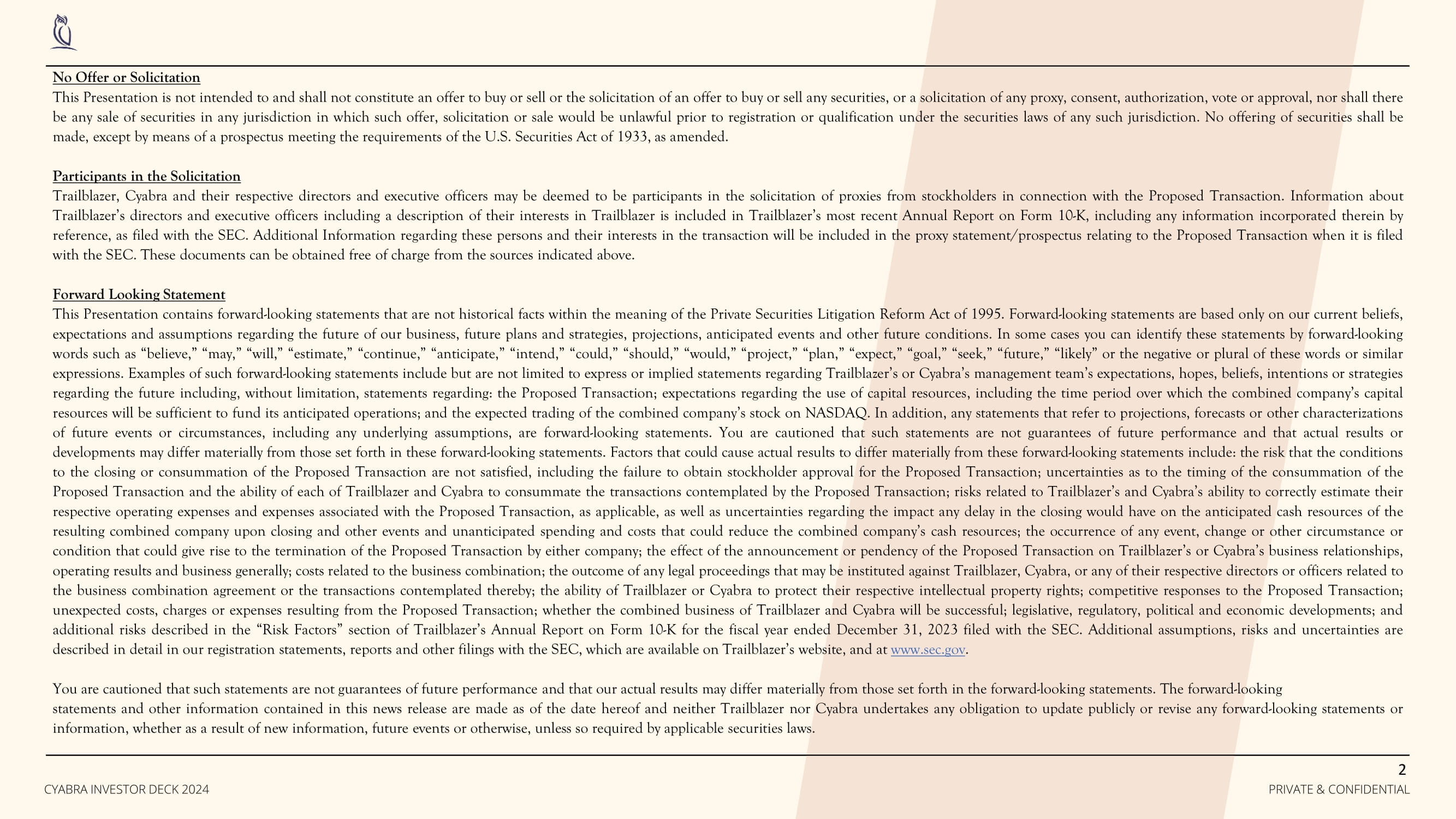 No Offer or Solicitation This Presentation is not intended to and shall not constitute an offer to buy or sell or the solicitation of an offer to buy or sell any securities, or a solicitation of any proxy, consent, authorization, vote or approval, nor shall there be any sale of securities in any jurisdiction in which such offer, solicitation or sale would be unlawful prior to registration or qualification under the securities laws of any such jurisdiction . No offering of securities shall be made, except by means of a prospectus meeting the requirements of the U . S . Securities Act of 1933 , as amended . Participants in the Solicitation Trailblazer, Cyabra and their respective directors and executive officers may be deemed to be participants in the solicitation of proxies from stockholders in connection with the Proposed Transaction . Information about Trailblazer’s directors and executive officers including a description of their interests in Trailblazer is included in Trailblazer’s most recent Annual Report on Form 10 - K, including any information incorporated therein by reference, as filed with the SEC . Additional Information regarding these persons and their interests in the transaction will be included in the proxy statement/prospectus relating to the Proposed Transaction when it is filed with the SEC . These documents can be obtained free of charge from the sources indicated above . Forward Looking Statement This Presentation contains forward - looking statements that are not historical facts within the meaning of the Private Securities Litigation Reform Act of 1995 . Forward - looking statements are based only on our current beliefs, expectations and assumptions regarding the future of our business, future plans and strategies, projections, anticipated events and other future conditions . In some cases you can identify these statements by forward - looking words such as “believe,” “may,” “will,” “estimate,” “continue,” “anticipate,” “intend,” “could,” “should,” “would,” “project,” “plan,” “expect,” “goal,” “seek,” “future,” “likely” or the negative or plural of these words or similar expressions . Examples of such forward - looking statements include but are not limited to express or implied statements regarding Trailblazer’s or Cyabra’s management team’s expectations, hopes, beliefs, intentions or strategies regarding the future including, without limitation, statements regarding : the Proposed Transaction ; expectations regarding the use of capital resources, including the time period over which the combined company’s capital resources will be sufficient to fund its anticipated operations ; and the expected trading of the combined company’s stock on NASDAQ . In addition, any statements that refer to projections, forecasts or other characterizations of future events or circumstances, including any underlying assumptions, are forward - looking statements . You are cautioned that such statements are not guarantees of future performance and that actual results or developments may differ materially from those set forth in these forward - looking statements . Factors that could cause actual results to differ materially from these forward - looking statements include : the risk that the conditions to the closing or consummation of the Proposed Transaction are not satisfied, including the failure to obtain stockholder approval for the Proposed Transaction ; uncertainties as to the timing of the consummation of the Proposed Transaction and the ability of each of Trailblazer and Cyabra to consummate the transactions contemplated by the Proposed Transaction ; risks related to Trailblazer’s and Cyabra’s ability to correctly estimate their respective operating expenses and expenses associated with the Proposed Transaction, as applicable, as well as uncertainties regarding the impact any delay in the closing would have on the anticipated cash resources of the resulting combined company upon closing and other events and unanticipated spending and costs that could reduce the combined company’s cash resources ; the occurrence of any event, change or other circumstance or condition that could give rise to the termination of the Proposed Transaction by either company ; the effect of the announcement or pendency of the Proposed Transaction on Trailblazer’s or Cyabra’s business relationships, operating results and business generally ; costs related to the business combination ; the outcome of any legal proceedings that may be instituted against Trailblazer, Cyabra, or any of their respective directors or officers related to the business combination agreement or the transactions contemplated thereby ; the ability of Trailblazer or Cyabra to protect their respective intellectual property rights ; competitive responses to the Proposed Transaction ; unexpected costs, charges or expenses resulting from the Proposed Transaction ; whether the combined business of Trailblazer and Cyabra will be successful ; legislative, regulatory, political and economic developments ; and additional risks described in the “Risk Factors” section of Trailblazer’s Annual Report on Form 10 - K for the fiscal year ended December 31 , 2023 filed with the SEC . Additional assumptions, risks and uncertainties are described in detail in our registration statements, reports and other filings with the SEC, which are available on Trailblazer’s website, and at www . sec . gov . You are cautioned that such statements are not guarantees of future performance and that our actual results may differ materially from those set forth in the forward - looking statements . The forward - looking statements and other information contained in this news release are made as of the date hereof and neither Trailblazer nor Cyabra undertakes any obligation to update publicly or revise any forward - looking statements or information, whether as a result 
