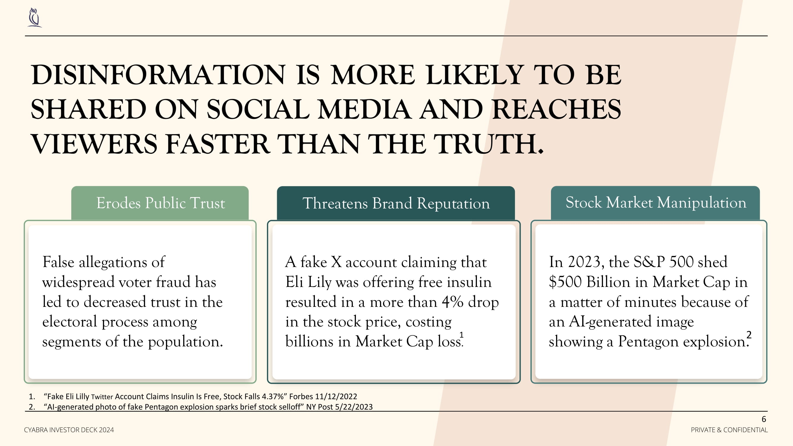 DISINFORMATION IS MORE LIKELY TO BE SHARED ON SOCIAL MEDIA AND REACHES VIEWERS FASTER THAN THE TRUTH . Threatens Brand Reputation A fake X account claiming that Eli Lily was offering free insulin resulted in a more than 4% drop in the stock price, costing billions in Market Cap loss . False allegations of widespread voter fraud has led to decreased trust in the electoral process among segments of the population. Erodes Public Trust Stock Market Manipulation 6 PRIVATE & CONFIDENTIAL CYABRA INVESTOR DECK 2024 1 In 2023, the S&P 500 shed $500 Billion in Market Cap in a matter of minutes because of an AI - generated image showing a Pentagon explosion. 2 1. “Fake Eli Lilly Twitter Account Claims Insulin Is Free, Stock Falls 4.37%” Forbes 11/12/2022 2. “AI - generated photo of fake Pentagon explosion sparks brief stock selloff” NY Post 5/22/2023