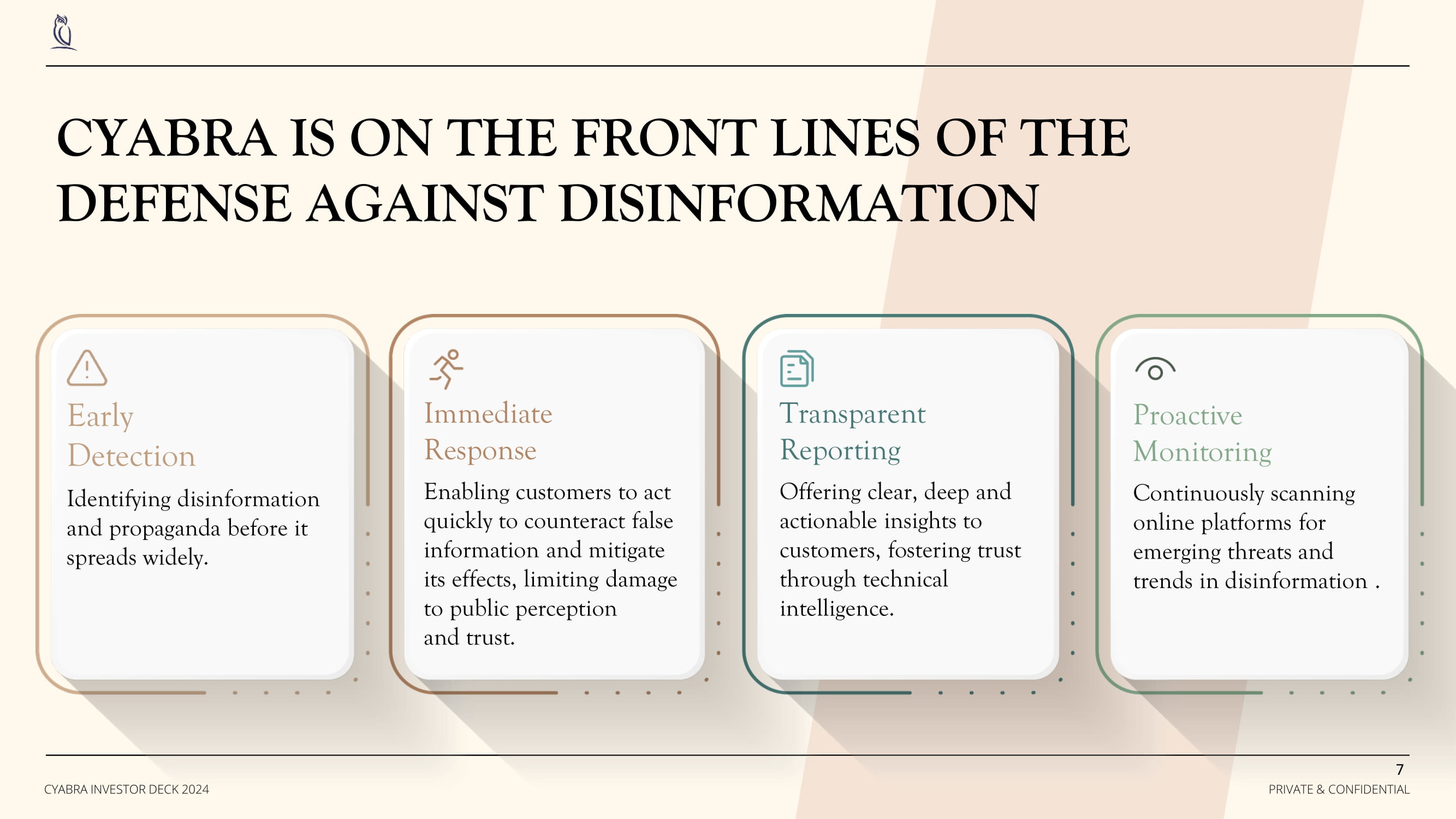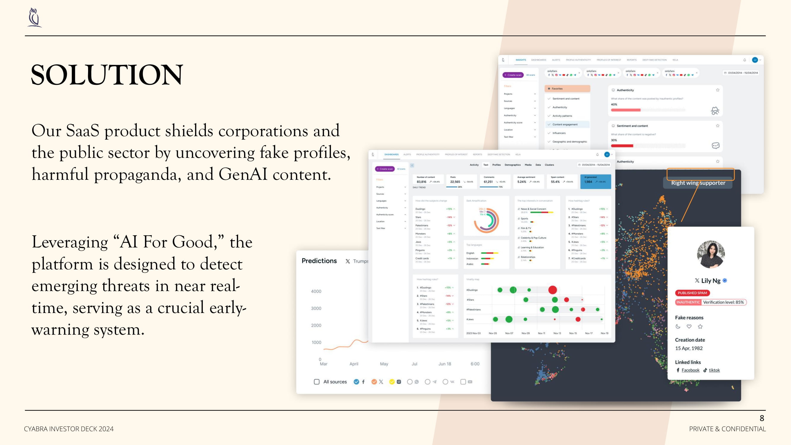 SOLUTION 8 PRIVATE & CONFIDENTIAL CYABRA INVESTOR DECK 2024 Our SaaS product shields corporations and the public sector by uncovering fake profiles, harmful propaganda, and GenAI content. Leveraging “AI For Good,” the platform is designed to detect emerging threats in near real - time, serving as a crucial early - warning system.