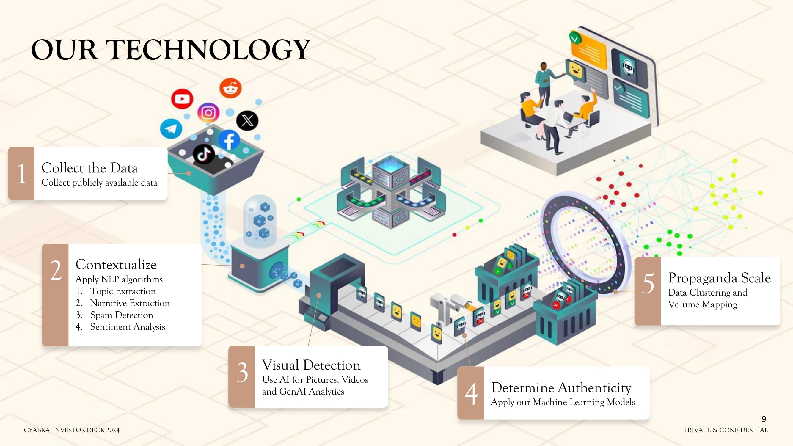 OUR TECHNOLOGY Collect the Data Collect publicly available data 1 Contextualize Apply NLP algorithms 1. Topic Extraction 2. Narrative Extraction 3. Spam Detection 4. Sentiment Analysis 2 Visual Detection Use AI for Pictures, Videos and GenAI Analytics 3 Determine Authenticity Apply our Machine Learning Models 4 Propaganda Scale Data Clustering and Volume Mapping 5 CYABRA INVESTOR DECK 2024 PRIVATE & CONFIDENTIAL 9 PRIVATE & CONFIDENTIAL CYABRA INVESTOR DECK 2024