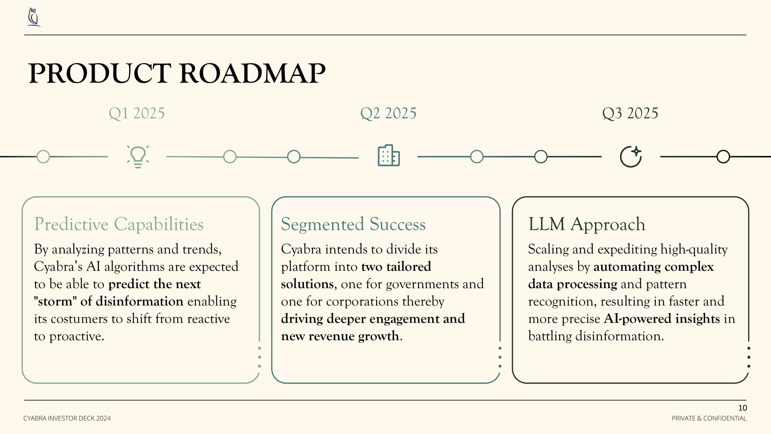 PRODUCT ROADMAP Predictive Capabilities By analyzing patterns and trends, Cyabra’s AI algorithms are expected to be able to predict the next "storm" of disinformation enabling its costumers to shift from reactive to proactive. Q1 2025 Q2 2025 Q3 2025 Segmented Success Cyabra intends to divide its platform into two tailored solutions , one for governments and one for corporations thereby driving deeper engagement and new revenue growth . 10 PRIVATE & CONFIDENTIAL CYABRA INVESTOR DECK 2024 LLM Approach Scaling and expediting high - quality analyses by automating complex data processing and pattern recognition, resulting in faster and more precise AI - powered insights in battling disinformation.