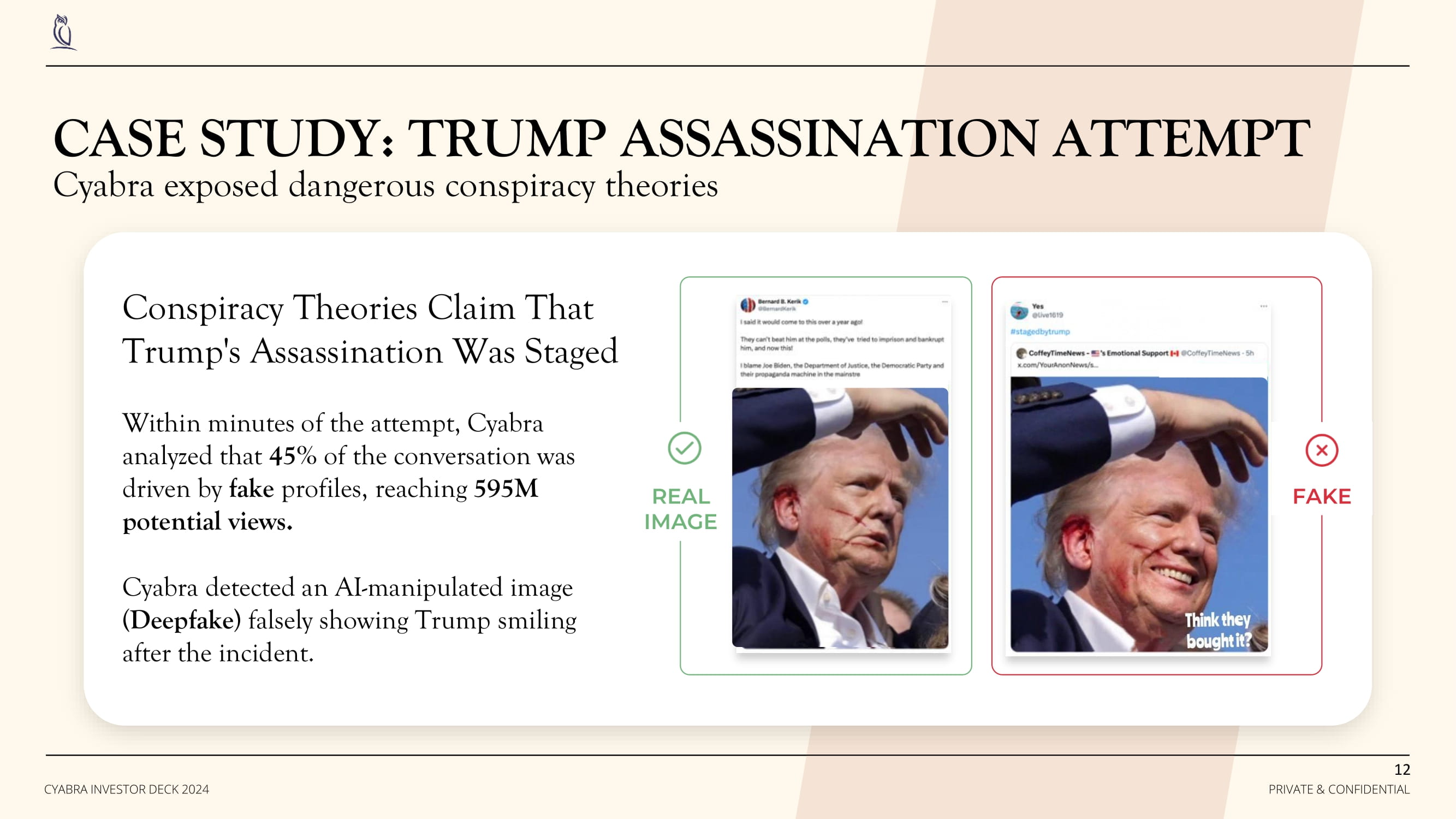 Conspiracy Theories Claim That Trump's Assassination Was Staged Within minutes of the attempt, Cyabra analyzed that 45% of the conversation was driven by fake profiles, reaching 595M potential views. Cyabra detected an AI - manipulated image ( Deepfake ) falsely showing Trump smiling after the incident . FAKE REAL IMAGE CASE STUDY: TRUMP ASSASSINATION ATTEMPT Cyabra exposed dangerous conspiracy theories 12 PRIVATE & CONFIDENTIAL CYABRA INVESTOR DECK 2024