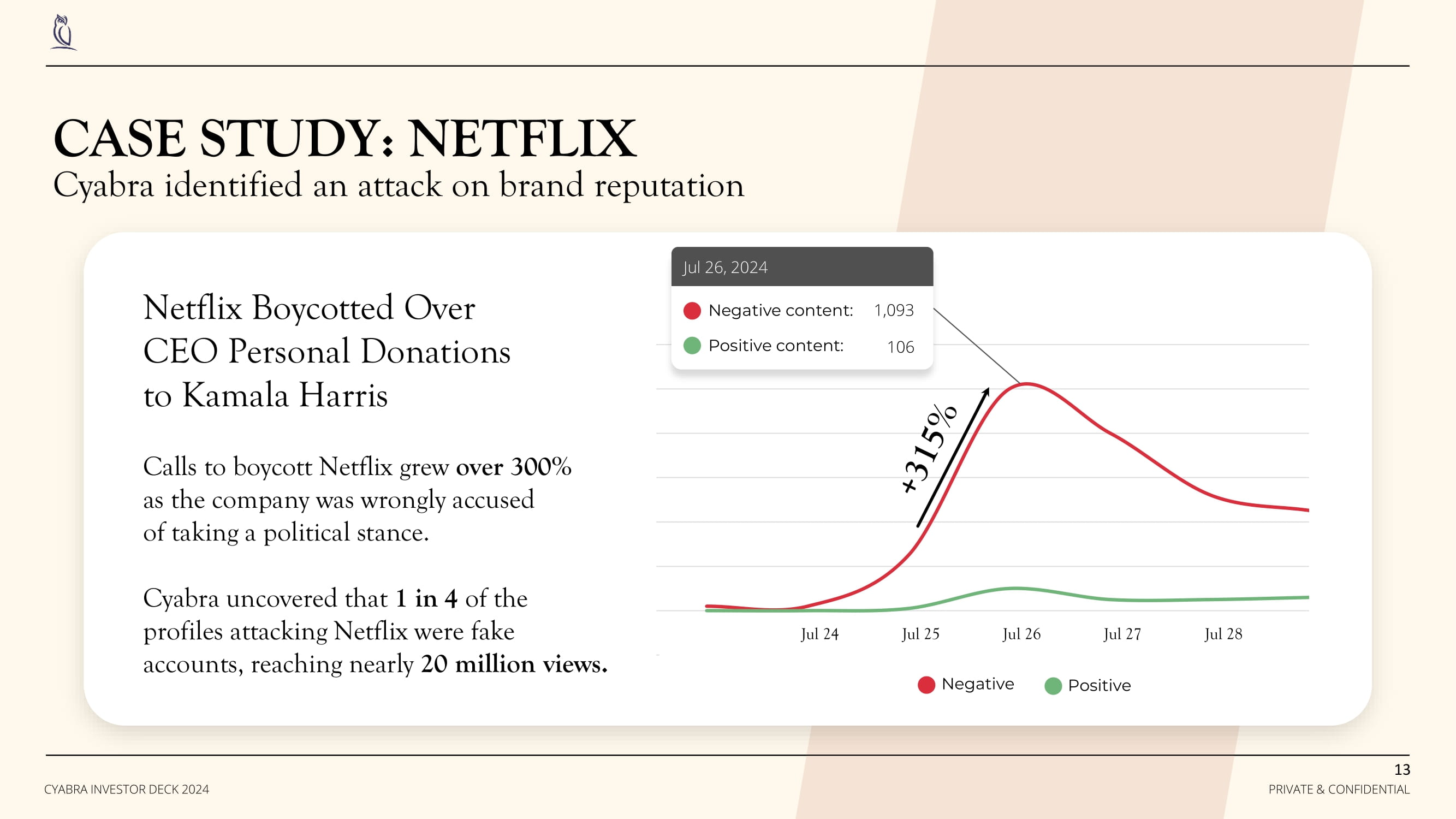 Netflix Boycotted Over CEO Personal Donations to Kamala Harris Calls to boycott Netflix grew over 300% as the company was wrongly accused of taking a political stance. Cyabra uncovered that 1 in 4 of the profiles attacking Netflix were fake accounts, reaching nearly 20 million views. jul 23 Jul 24 Jul 25 Jul 26 Jul 27 Jul 28 Jul 29 Jul 24 Jul 25 Jul 26 Jul 27 Jul 28 Negative content: Positive content: 1,093 106 Jul 26, 2024 Negative Positive CASE STUDY: NETFLIX Cyabra identified an attack on brand reputation 13 PRIVATE & CONFIDENTIAL CYABRA INVESTOR DECK 2024