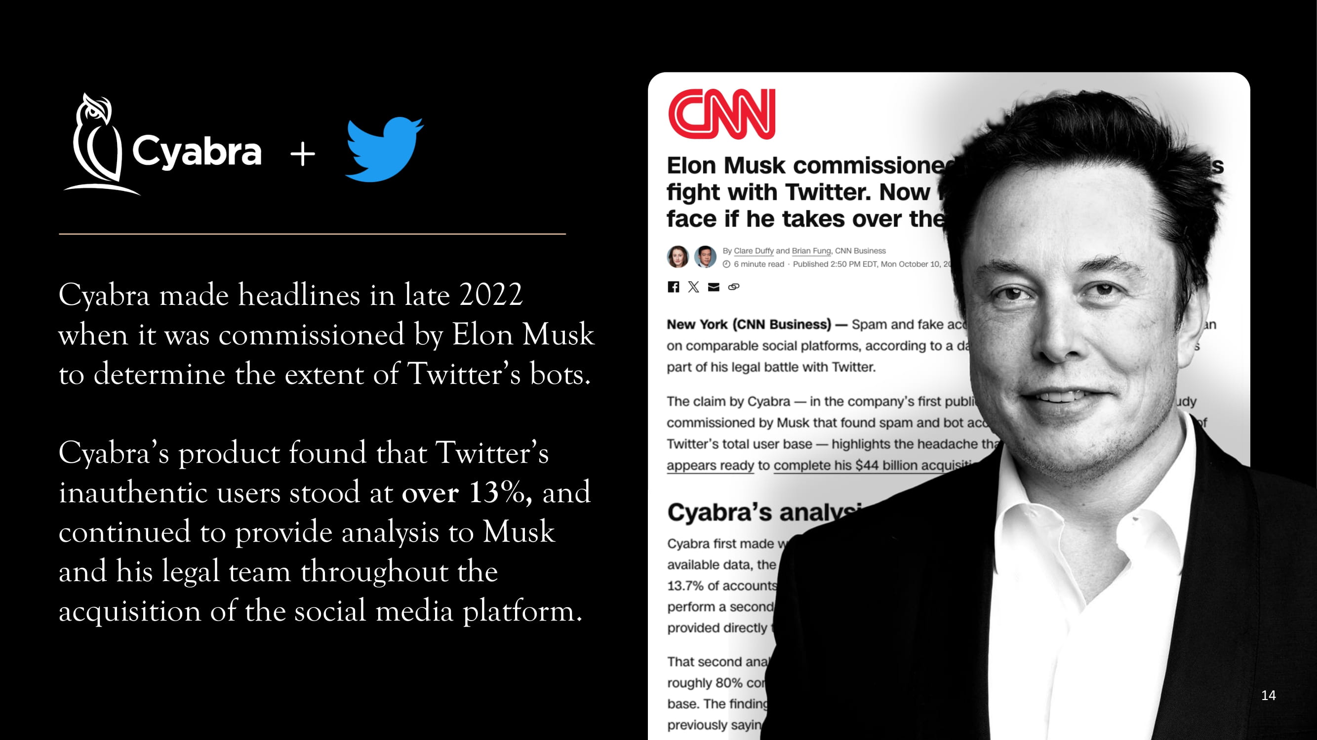 Cyabra made headlines in late 2022 when it was commissioned by Elon Musk to determine the extent of Twitter’s bots. Cyabra’s product found that Twitter’s inauthentic users stood at over 13%, and continued to provide analysis to Musk and his legal team throughout the acquisition of the social media platform. 14