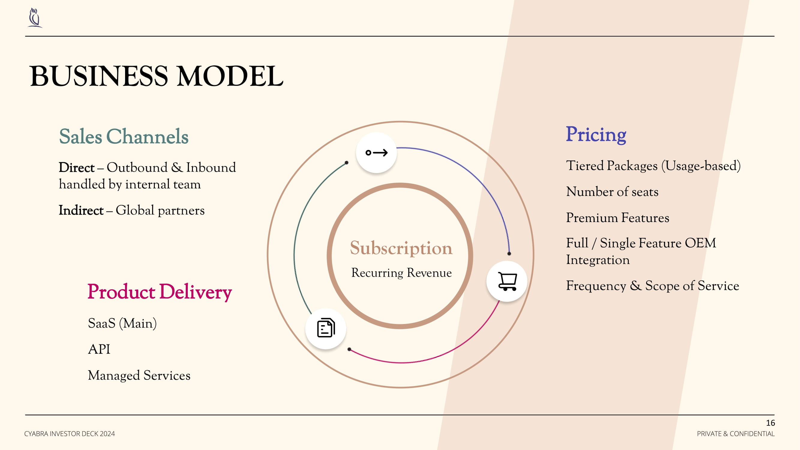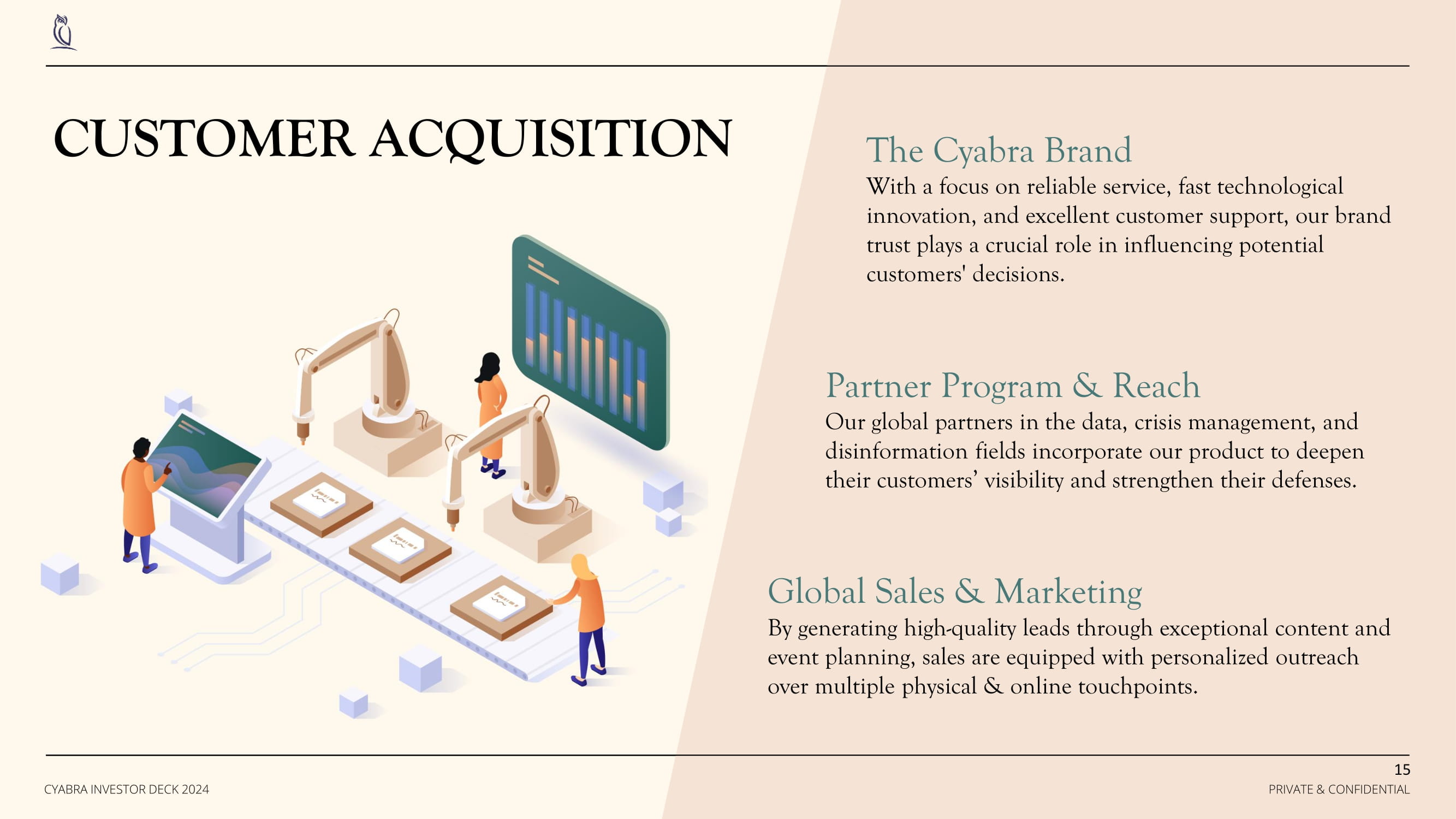 CUSTOMER ACQUISITION The Cyabra Brand With a focus on reliable service, fast technological innovation, and excellent customer support, our brand trust plays a crucial role in influencing potential customers' decisions. Partner Program & Reach Our global partners in the data, crisis management, and disinformation fields incorporate our product to deepen their customers’ visibility and strengthen their defenses . Global Sales & Marketing By generating high - quality leads through exceptional content and event planning, sales are equipped with personalized outreach over multiple physical & online touchpoints. 15 PRIVATE & CONFIDENTIAL CYABRA INVESTOR DECK 2024