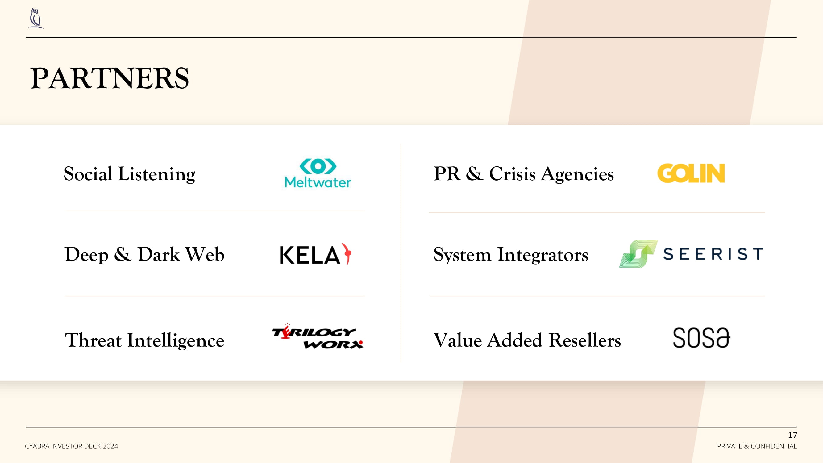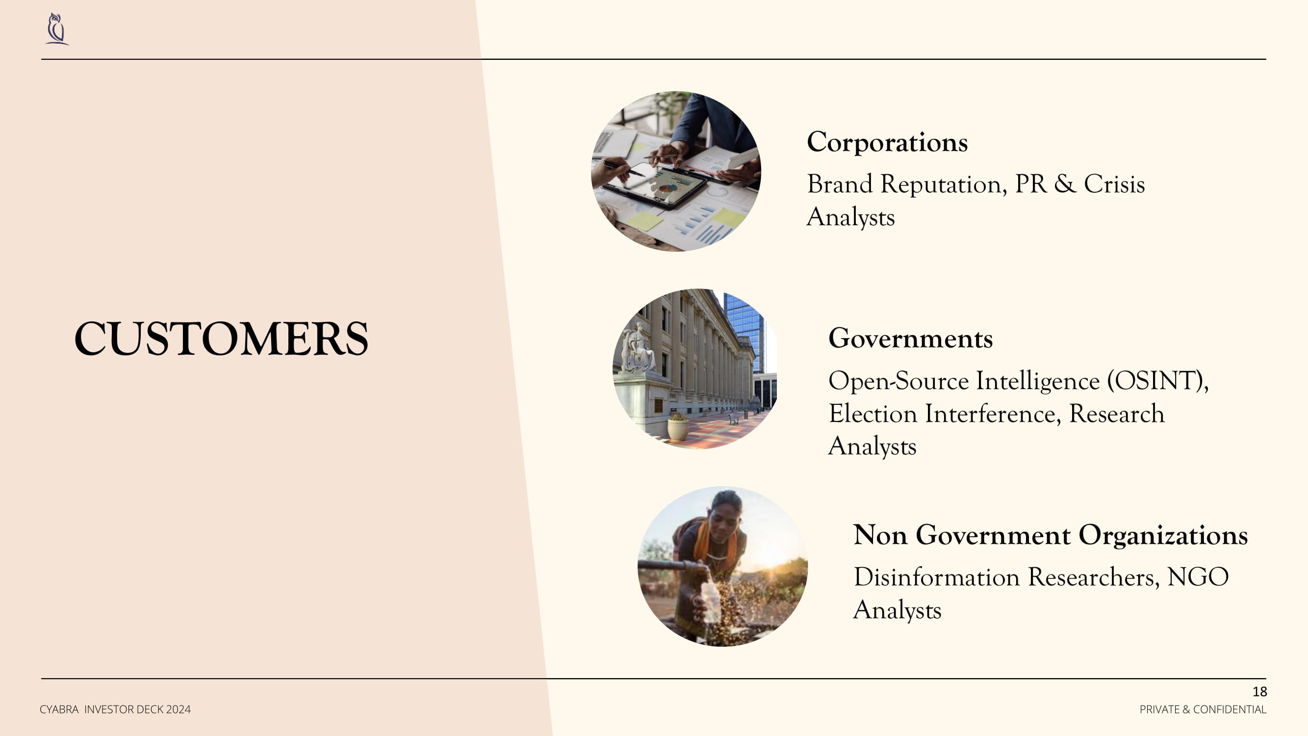 PARTNERS Social Listening Deep & Dark Web Threat Intelligence PR & Crisis Agencies System Integrators Value Added Resellers 17 PRIVATE & CONFIDENTIAL CYABRA INVESTOR DECK 2024