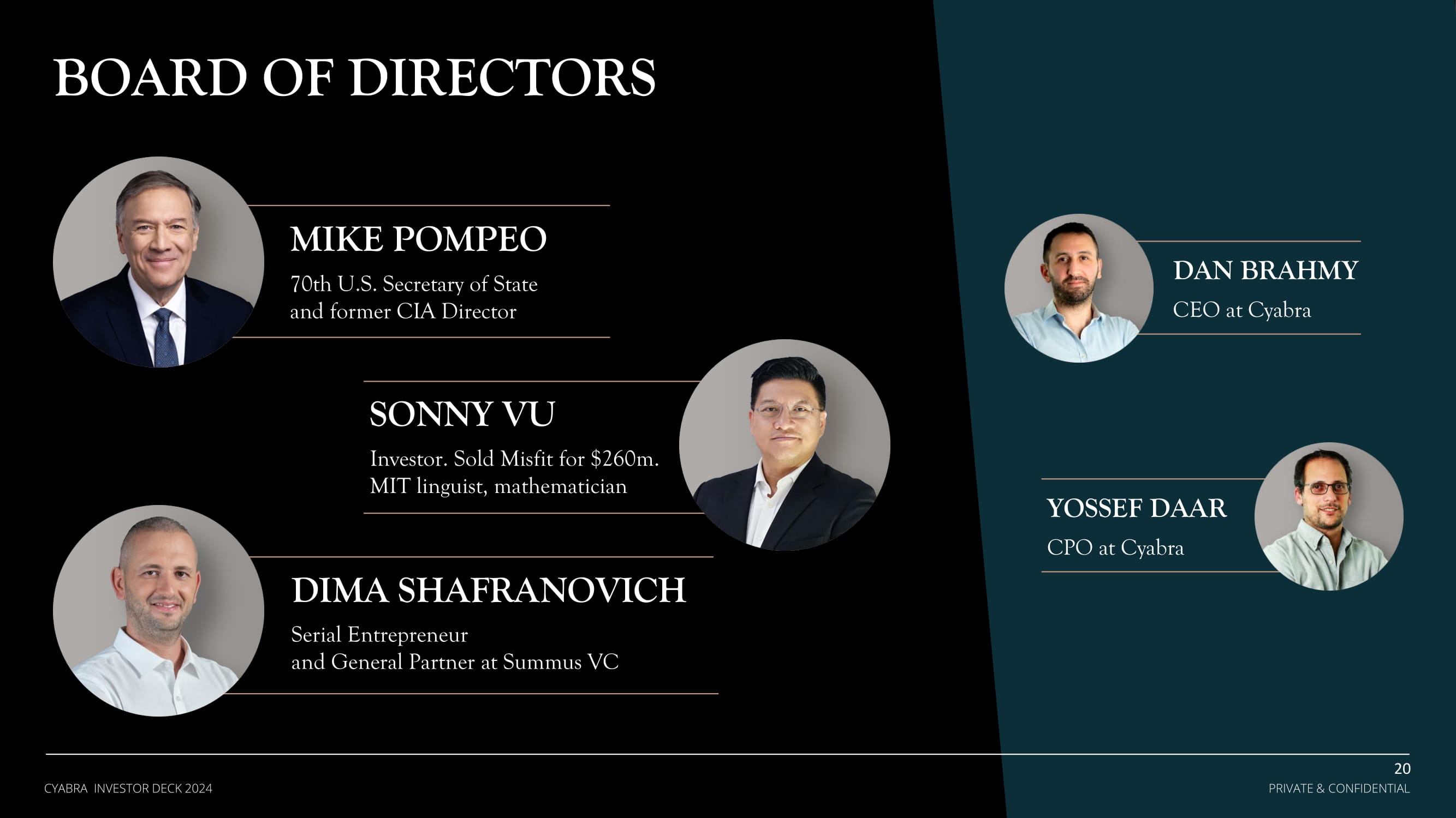MIKE POMPEO 70th U.S. Secretary of State and former CIA Director BOARD OF DIRECTORS SONNY VU Investor. Sold Misfit for $260m. MIT linguist, mathematician DIMA SHAFRANOVICH Serial Entrepreneur and General Partner at Summus VC DAN BRAHMY CEO at Cyabra YOSSEF DAAR CPO at Cyabra 20 PRIVATE & CONFIDENTIAL CYABRA INVESTOR DECK 2024