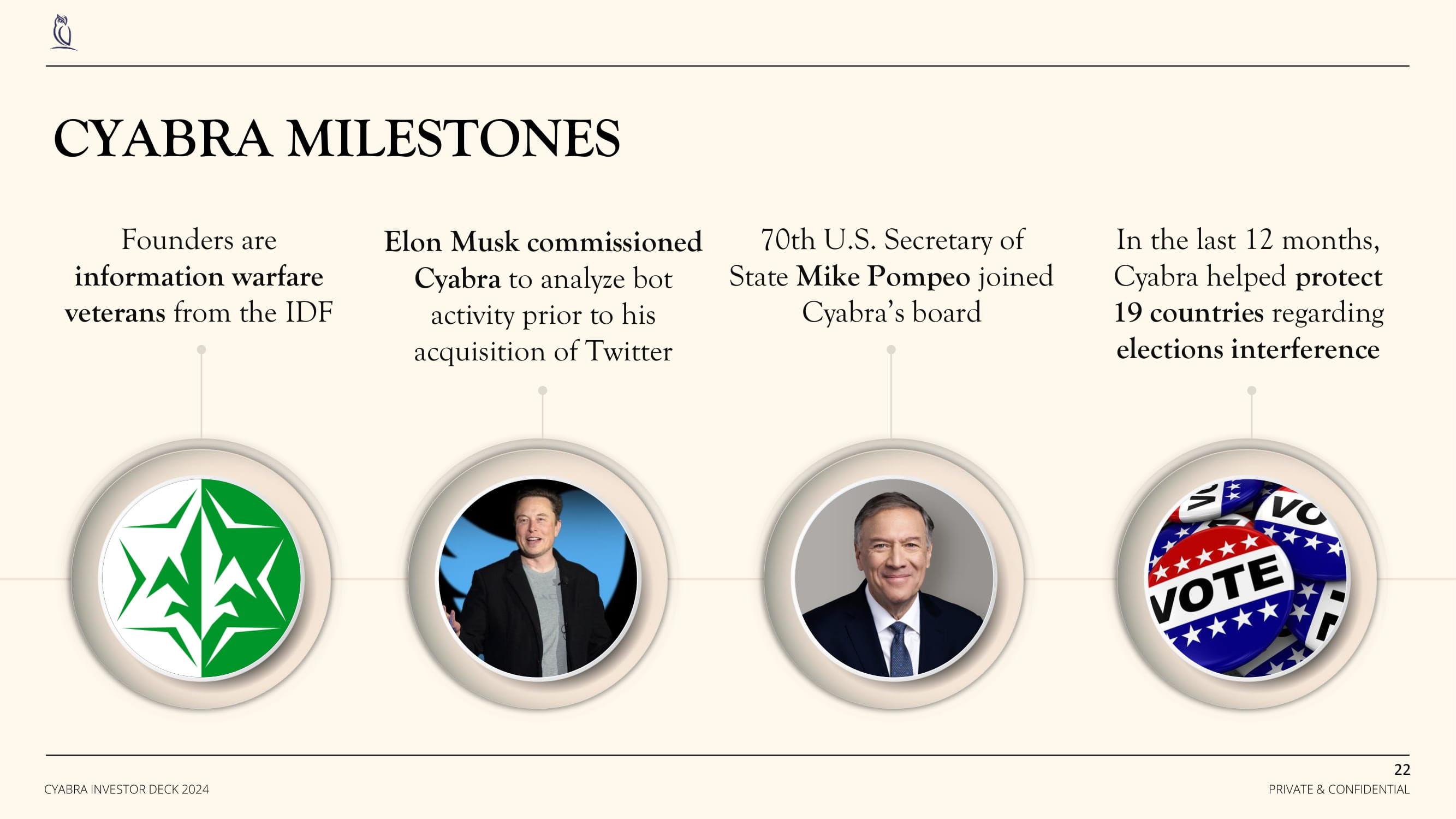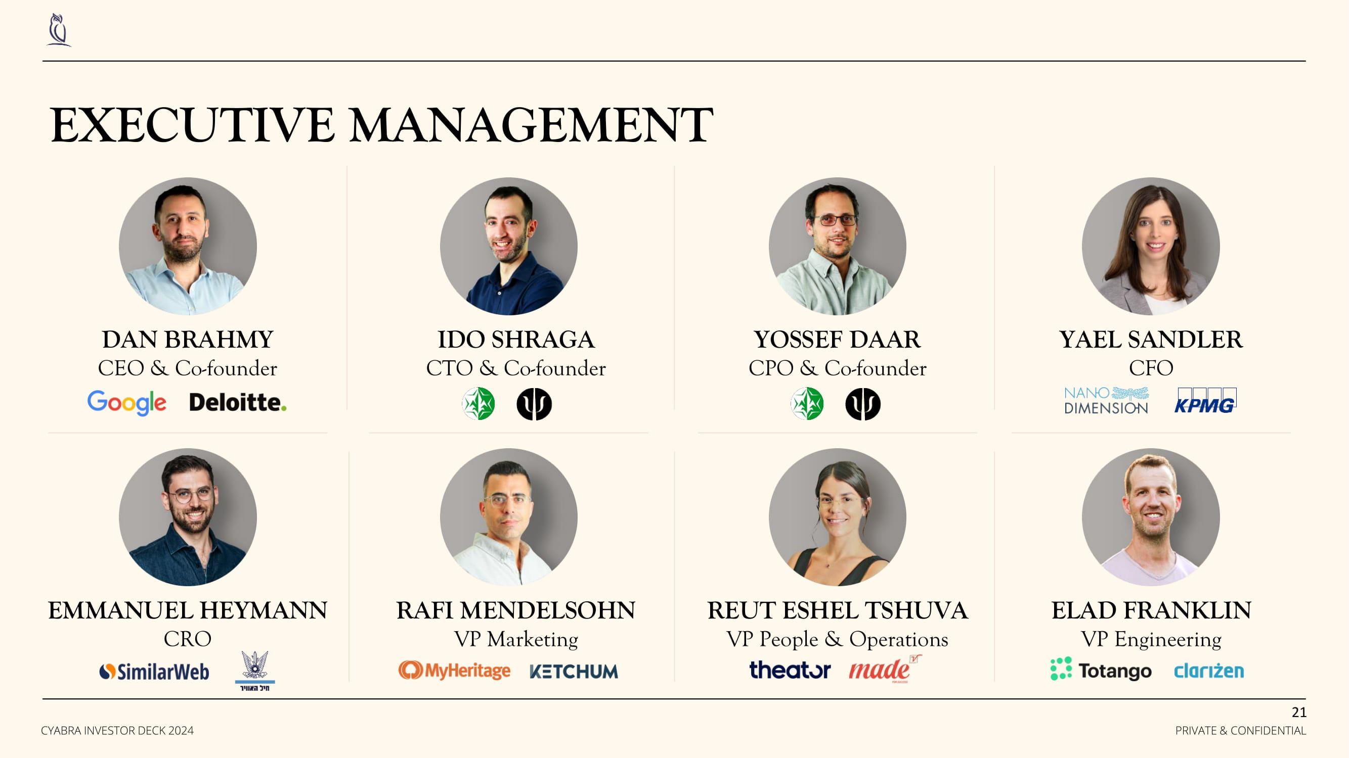 EXECUTIVE MANAGEMENT DAN BRAHMY CEO & Co - founder IDO SHRAGA CTO & Co - founder YOSSEF DAAR CPO & Co - founder EMMANUEL HEYMANN CRO RAFI MENDELSOHN VP Marketing REUT ESHEL TSHUVA VP People & Operations YAEL SANDLER CFO ELAD FRANKLIN VP Engineering 21 PRIVATE & CONFIDENTIAL CYABRA INVESTOR DECK 2024