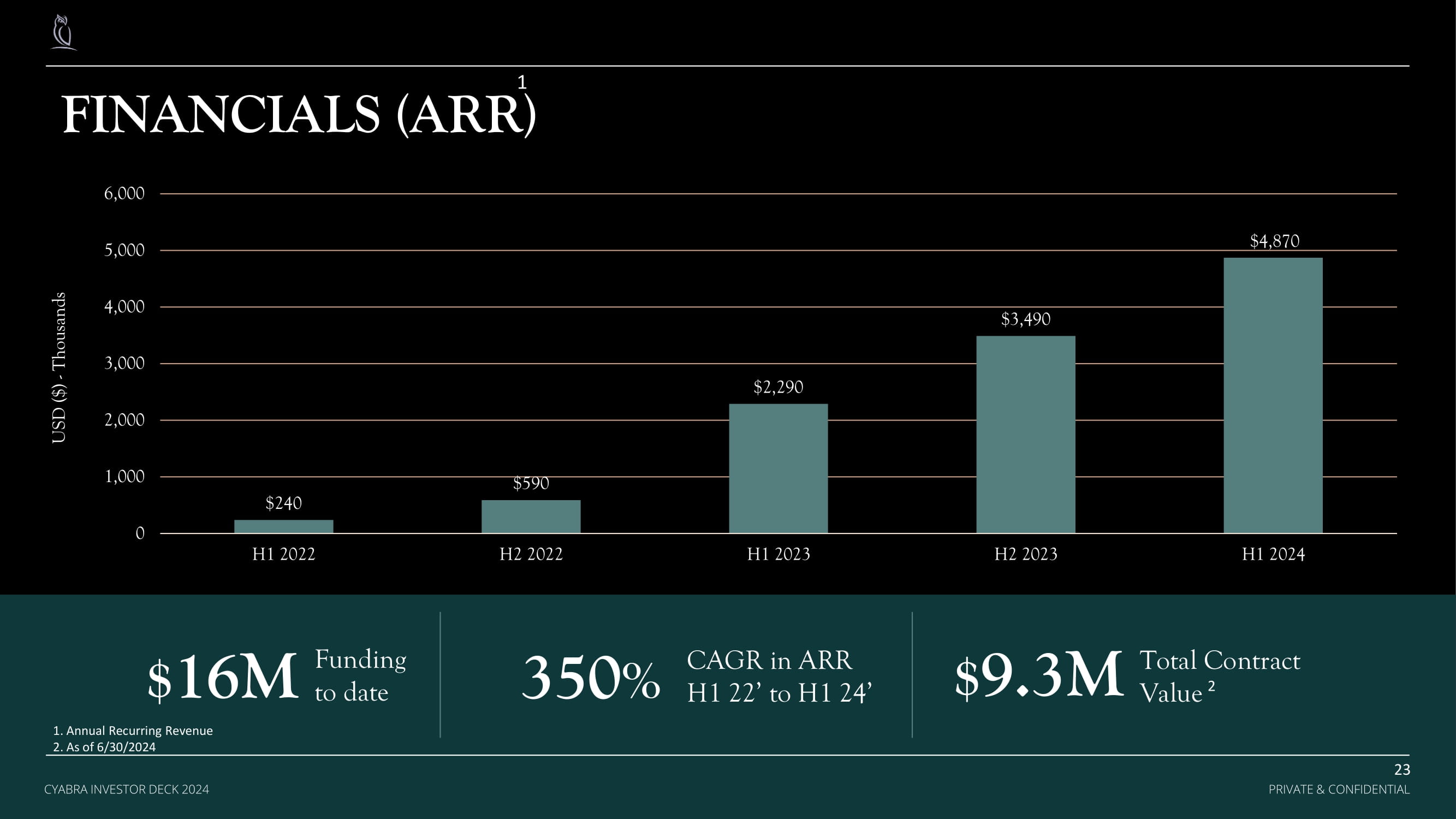 FINANCIALS (ARR) $240 $590 $2,290 $3,490 $4,870 0 1,000 2,000 3,000 4,000 5,000 6,000 H1 2022 H2 2022 H1 2023 H2 2023 H1 2024 USD ($) - Thousands CAGR in ARR H1 22’ to H1 24’ $ 16M 350 % Funding to date $ 9.3M CYABRA INVESTOR DECK 2024 PRIVATE & CONFIDENTIAL 23 PRIVATE & CONFIDENTIAL CYABRA INVESTOR DECK 2024 1 1. Annual Recurring Revenue 2. As of 6/30/2024 Total Contract Value 2
