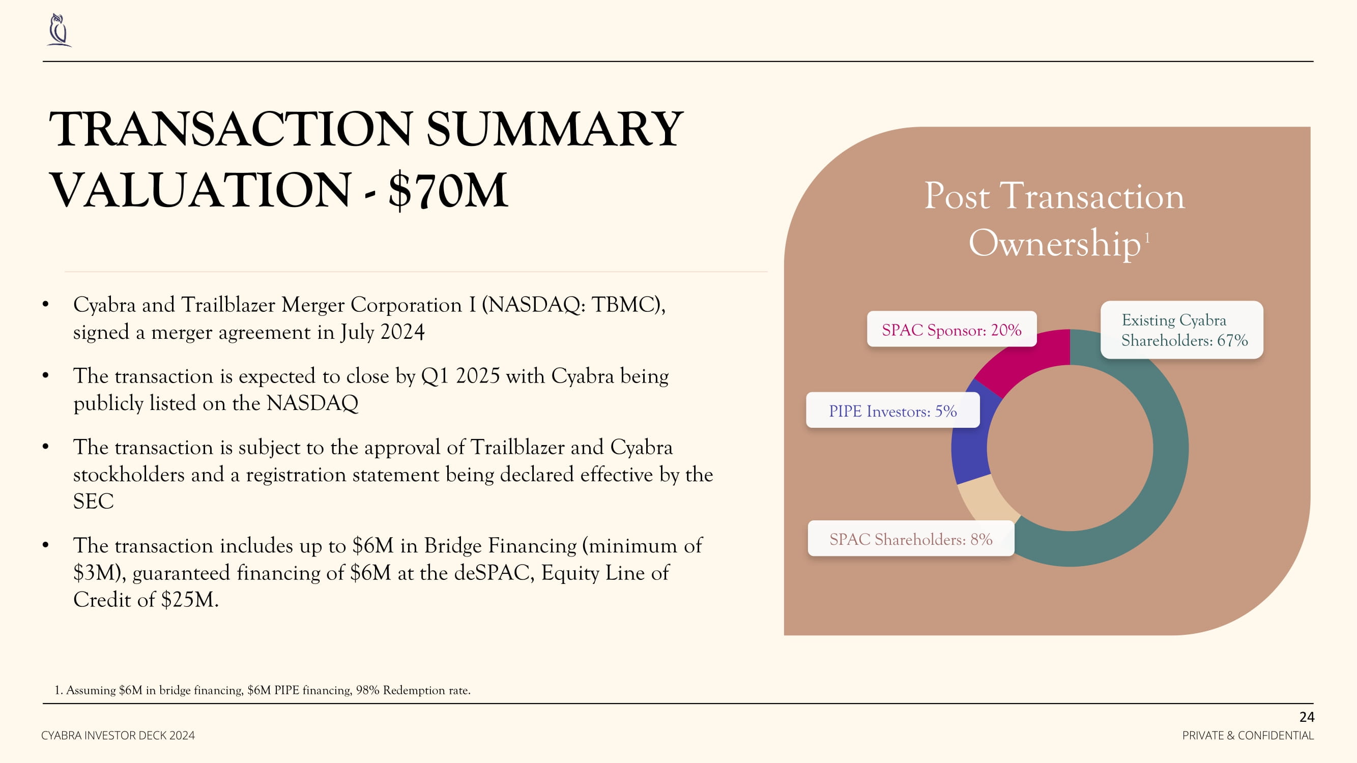 • Cyabra and Trailblazer Merger Corporation I (NASDAQ: TBMC), signed a merger agreement in July 2024 • The transaction is expected to close by Q1 2025 with Cyabra being publicly listed on the NASDAQ • The transaction is subject to the approval of Trailblazer and Cyabra stockholders and a registration statement being declared effective by the SEC • The transaction includes up to $6M in Bridge Financing (minimum of $3M), guaranteed financing of $6M at the deSPAC, Equity Line of Credit of $25M. TRANSACTION SUMMARY VALUATION - $70M Post Transaction Ownership 1 1. Assuming $6M in bridge financing, $6M PIPE financing, 98% Redemption rate. Existing Cyabra Shareholders: 67% SPAC Shareholders: 8% PIPE Investors: 5% SPAC Sponsor: 20% 24 PRIVATE & CONFIDENTIAL CYABRA INVESTOR DECK 2024