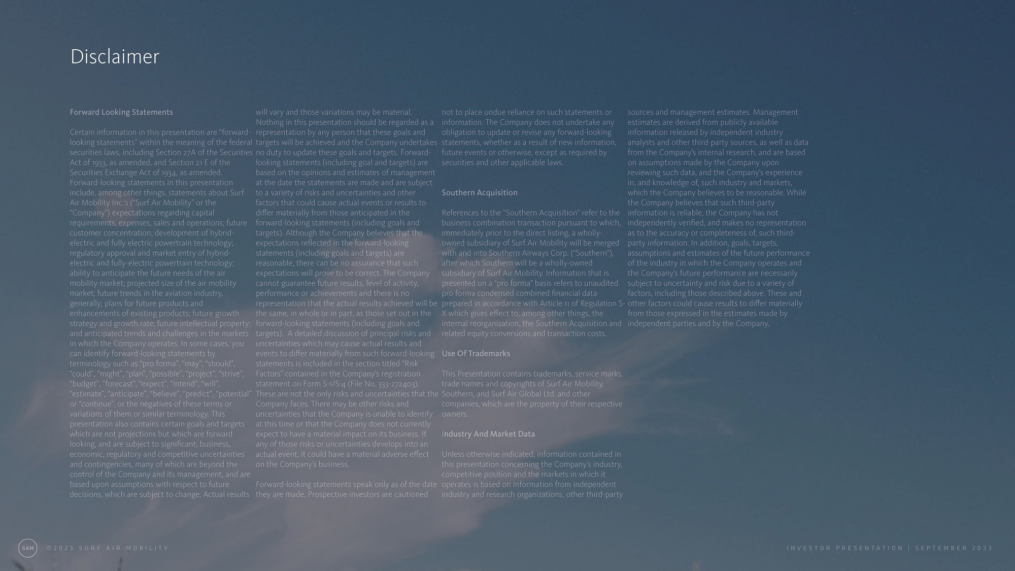 F o r w ard L ooking S t a t ements A c t o f 1 9 3 3, as amended, and Se c tion 2 1 E o f the Securities E x change A c t o f 1 9 34, as amended. Forward - looking statements in this presentation include, among other things, statements about Surf Air Mobility Inc.’s (“Surf Air Mobility” or the “ C ompa n y”) e xpe c t a tions r egarding capi t al r e q ui r ements, e xpenses, s ales and oper a tions; f u t u r e customer concentration; development of hybrid - elec tric and f u l ly elec tric po w e r train t echnolo g y ; regulatory approval and market entry of hybrid - elec tric and f u l ly - ele c tric po w e r train t echnolo g y ; ability to anticipate the future needs of the air mobility market; projected size of the air mobility ma r k et; f u t u r e t r ends in the a vi a tion indust r y , genera l l y ; plans f or f u t u r e produ cts and or “ c ontinu e ”, or the neg ati v es o f these t erms or vari a tions o f them or similar t erminolo g y . This which a r e not proje c tions but which a r e f o r ward looking, and are subject to significant, business, wi l l va r y and those vari a tions m a y be m a terial. Nothing in this presentation should be regarded as a securities laws, including Section 27A of the Securities no duty to update these goals and targets. Forward - looking statements (including goal and targets) are based on the opinions and estimates of management a t the d a t e the s t a t ements a r e made and a r e subject to a variety of risks and uncertainties and other factors that could cause actual events or results to differ materially from those anticipated in the f o r ward - looking s t a t ements (including goals and targets). Although the Company believes that the e xpe c t a tions r e fl e c t ed in the f o r ward - looking s t a t ements (including goals and t a r gets) a r e r easonable, the r e c an be no assurance th a t such e xpe c t a tions wi l l pr ov e to be c orr e c t . The C ompa n y cannot guarantee future results, level of activity, pe r f ormance or achie v ements and the r e is no “could”, “might”, “plan”, “possible”, “project”, “strive”, Factors” contained in the Company’s registration “bu d get”, “ f o r e c ast”, “ e xpe c t”, “in t end”, “wi l l”, s t a t ement on F orm S - 1/ S - 4 ( F ile N o . 33 3 - 2 7 2 4 0 3). C ompa ny f aces. The r e m a y be other risks and uncertainties that the Company is unable to identify p resen t a tion also c on t ains ce r t ain goals and t a r gets a t this time or th a t the C ompa ny does not currently e xpe c t to h av e a m a t erial impa c t on its business. If any of those risks or uncertainties develops into an e c onomi c , r e g ul a to r y and c ompetiti v e unce r t ainties a c t ual ev en t , it c ould h av e a m a t erial ad v erse e ff e c t and c ontingencies, man y o f which a r e be y ond the on the C ompa ny ’ s business. c ontrol o f the C ompa ny and its managemen t , and a r e not to place undue r eliance on such s t a t ements or information. The Company does not undertake any C e r t ain in f orma tion in this p resen t a tion a r e “ f o r ward - r ep r esen t a tion by a n y person th a t these goals and oblig a tion to upd a t e or r evise a n y f o r ward - looking looking statements” within the meaning of the federal targets will be achieved and the Company undertakes statements, whether as a result of new information, future events or otherwise, except as required by securities and other appli c able laws. Southern A c q uisition References to the “Southern Acquisition” refer to the business combination transaction pursuant to which, immediately prior to the direct listing, a wholly - owned subsidiary of Surf Air Mobility will be merged with and into Southern Airways Corp. (“Southern”), aft er which Southern wi l l be a who l ly - owned subsidiary of Surf Air Mobility. Information that is presented on a “pro forma” basis refers to unaudited pro forma condensed combined financial data enhancements of existing products; future growth the same, in whole or in part, as those set out in the X which gives effect to, among other things, the strategy and growth rate; future intellectual property; forward - looking statements (including goals and internal reorganization, the Southern Acquisition and and anticip a t ed t r ends and cha l lenges in the ma r k ets t a r gets). A de t ailed discussion o f principal risks and r el a t ed e q uity c o n v ersions and tran s a c tion c osts. in which the Company operates. In some cases, you uncertainties which may cause actual results and c an identi fy f o r ward - looking s t a t ements by ev ents to di ff er m a t eria l ly f rom such f o r ward - looking U se Of T rademar ks terminology such as “pro forma”, “may”, “should”, statements is included in the section titled “Risk This Presentation contains trademarks, service marks, trade names and c opyrights o f Su r f A ir Mobilit y , “estimate”, “anticipate”, “believe”, “predict”, “potential” These are not the only risks and uncertainties that the Southern, and Surf Air Global Ltd. and other companies, which are the property of their respective owners. I ndust ry And Mar k et D a t a U nless othe r wise indi c a t ed, in f orma tion c on t ained in this presentation concerning the Company’s industry, c ompetiti v e position and the ma r k ets in which it based upon assumptions with respect to future Forward - looking statements speak only as of the date operates is based on information from independent decisions, which are subject to change. Actual results they are made. Prospective investors are cautioned industry and research organizations, other third - party sources and management estimates. Management estimates are derived from publicly available in f orma tion r eleased by independent indust r y analysts and other third - party sources, as well as data from the