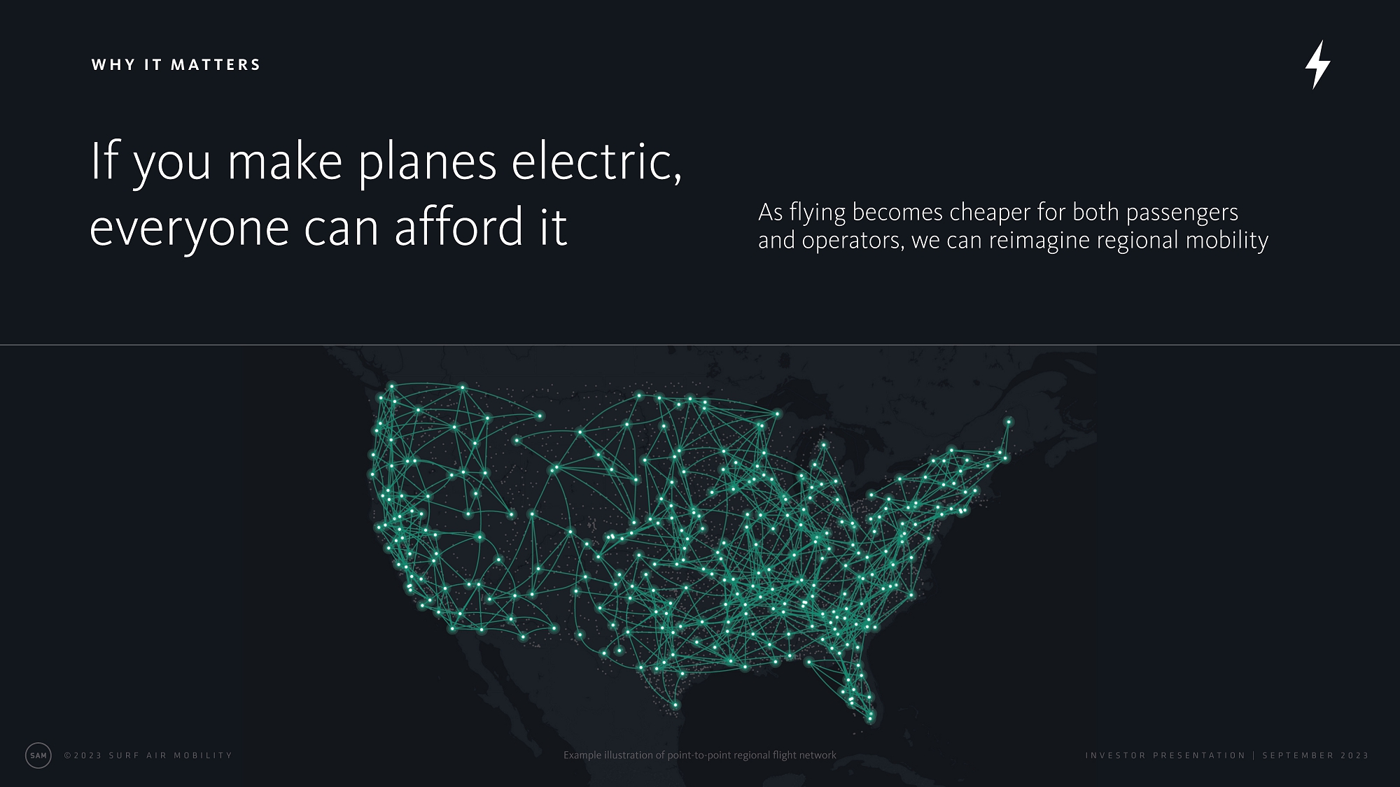 © 2 0 2 3 S U R F A I R M O B I L I T Y Example illustration of point - to - point regional flight network WH Y I T M A T TER S I N V E S T O R P R E S E N T A T I O N | S E P T E M B E R 2 0 2 3 If y ou ma k e planes ele c tri c , e v e r y one c an af f ord it As flying bec omes cheaper f or both passengers and oper a tors, w e c an r eim a gine r egional mobility