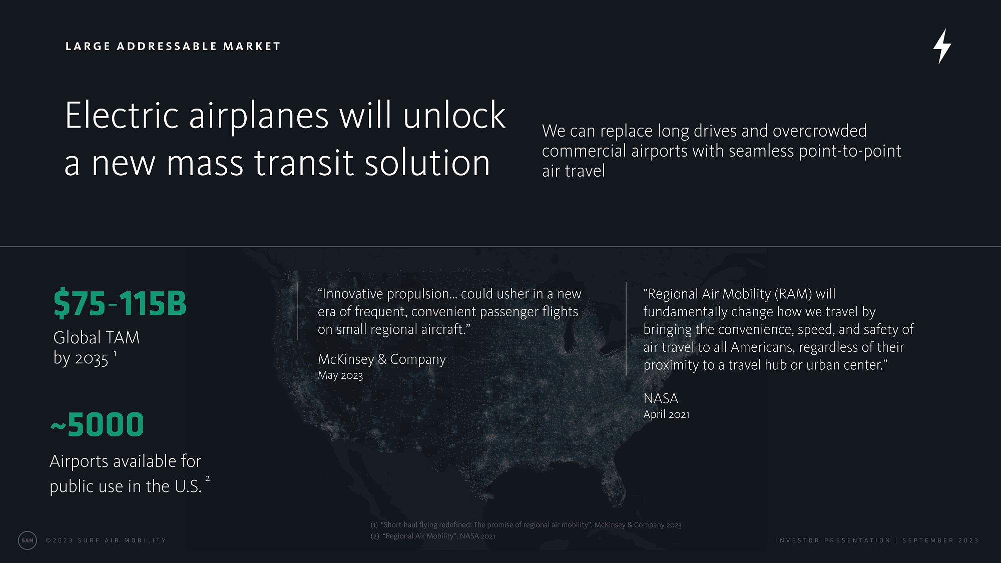 LAR GE ADDRE SS ABLE MARKET Ele c tric airplanes wi l l unlock a new mass transit solution W e c an r eplace long dri v es and o v e r cro w ded c omme r cial airpo r ts with seamless poin t - to - point air tr a v el (1) “Short - haul flying redefined: The promise of regional air mobility”, McKinsey & Company 2023 (2) “ R egional A ir Mobility”, NASA 20 2 1 I N V E S T O R P R E S E N T A T I O N | S E P T E M B E R 2 0 2 3 “Inn o v a ti v e propulsion … c ould usher in a new era of frequent, convenient passenger flights on sma l l r egional ai rcraf t . ” Mc K insey & C ompa ny M a y 20 2 3 © 2 0 2 3 S U R F A I R M O B I L I T Y $75 - 115B Global T AM by 2 0 35 1 ~5000 A irpo r ts a vailable f or public use in the U .S. 2 “Regional Air Mobility (RAM) will f undamen t a l ly change how w e tr a v el by bringing the c o n v enience, speed, and s a f ety o f air travel to all Americans, regardless of their proximity to a travel hub or urban center.” NASA April 20 2 1
