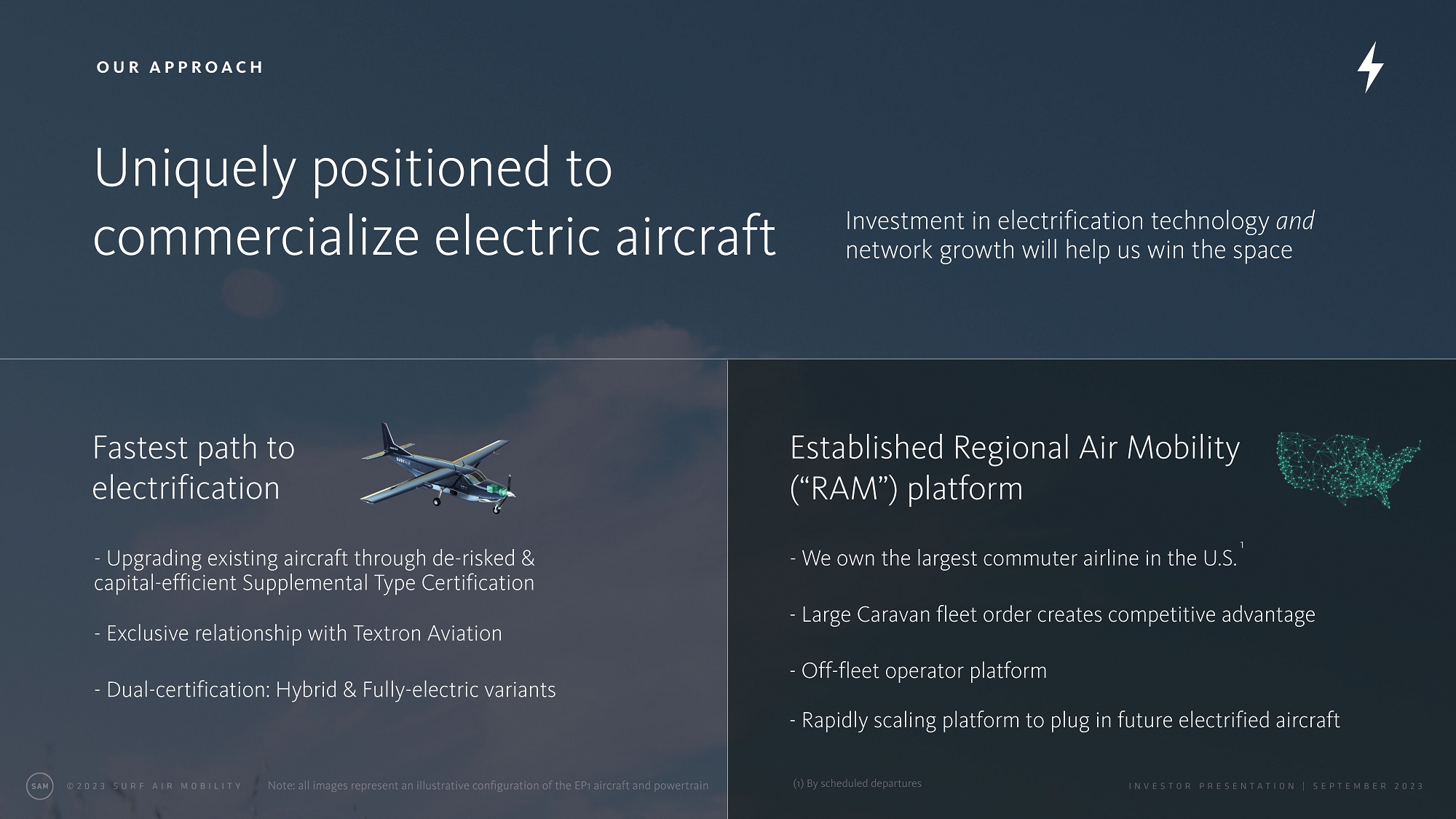© 2 0 2 3 S U R F A I R M O B I L I T Y I N V E S T O R P R E S E N T A T I O N | S E P T E M B E R 2 0 2 3 Es t ablished R egional A ir Mobility (“RA M ”) pl at f orm (1) B y scheduled depa r t u r es F as test p a th to electrification - U pgrading e xisting ai rcraft through de - ris k ed & capital - efficient Supplemental Type Certification - Exclusive relationship with Textron Aviation - Dual - certification: Hybrid & Fully - electric variants 1 O U R A P P R O A C H Note: all ex99-1s represent an illustrative configuration of the EP1 aircraft and powertrain - W e own the la r gest c ommu t er airline in the U .S. - Large Caravan fleet order creates competitive advantage - Of f - fleet oper a tor pl a t f orm - Rapidly scaling platform to plug in future electrified aircraft U ni q uely positioned to c omme r ciali z e ele c tric ai r craft I n v estment in elec trifi c a tion t echnolo g y and ne t wo r k gro w th wi l l he l p us win the space
