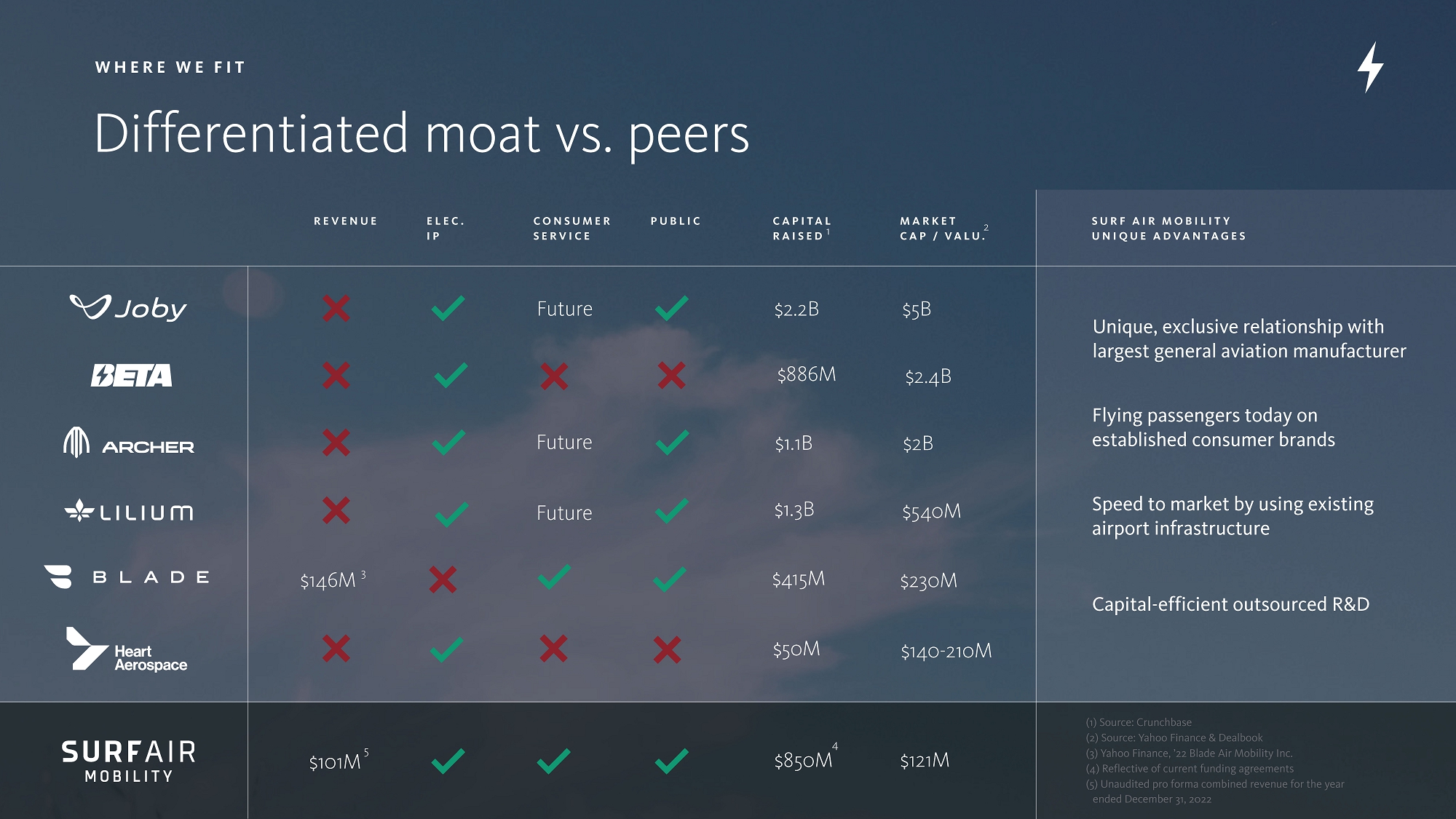$101M WHERE WE FIT PUBLIC REVENUE C O N S U M E R SE R VIC E S U R F A I R M O B I L I T Y UNI Q U E A D V AN T A G E S Unique, exclusive relationship with largest general aviation manufacturer Flying passengers tod a y on es t ablished c onsumer brands Speed to ma r k et by using e xisting airpo r t in f rastru c t ur e Capi t al - e fficient outsou r ced R&D (1) Sou r ce: Crunchbase (2) Source: Yahoo Finance & Dealbook (3) Y ahoo F inance, ’ 22 Blade A ir Mobility In c . (4) Reflective of current funding agreements (5) U n a udi t ed pro f orma c ombined r e v enue f or the y ear ended December 31, 2022 D if f e r enti a t ed mo a t vs. peers ELE C . IP $1 2 1M MARKET CA P / V A L U . $8 5 0M CAPI T A L 2 $1 4 0 - 2 10M $ 5 0M $2.4B $886M $146M 3 $ 2 30M $ 4 15M $2B $1.1B $5B $2.2B $ 5 4 0M $1.3B 4 Future Future Future RAISED 1 5
