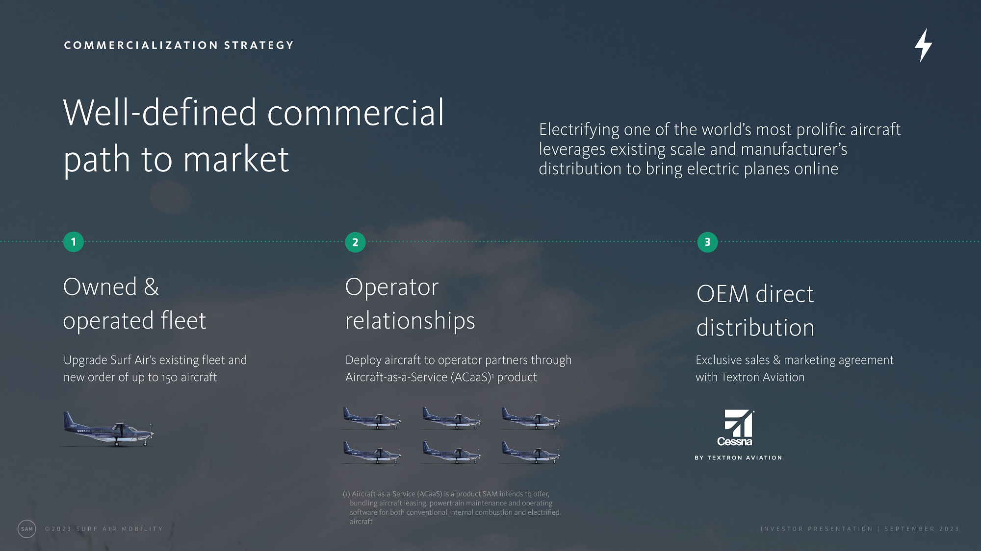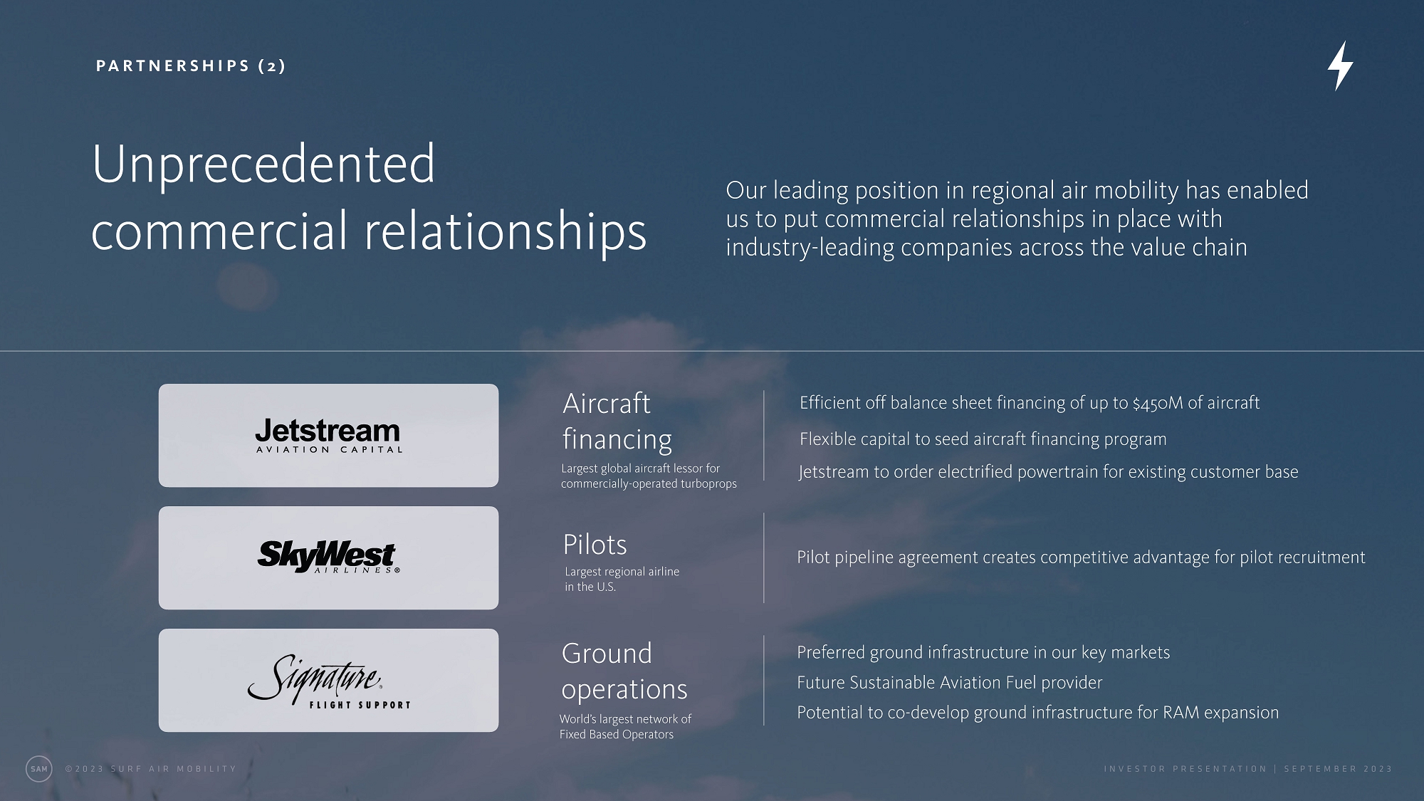 © 2 0 2 3 S U R F A I R M O B I L I T Y I N V E S T O R P R E S E N T A T I O N | S E P T E M B E R 2 0 2 3 P A R T N E R S H I P S ( 1 ) Unprecedented c omme r cial r el a tionships Our leading position in r egional air mobility has enabled us to put c omme r cial r el a tionships in place with industry - leading companies across the value chain Exclusive relationship to electrify Cessna Grand Caravan EX Electrified Caravan will be distributed by Textron Aviation to global customer base Large fleet order guarantees pricing and supply to scale RAM platform Co - developing definitive software / AI solutions for RAM industry L e ver a ge AI & ML f or A CaaS 2 produ c t (1) B y units sold (2) Aircraft - as - a - Service (ACaaS) is a product SAM intends to offer, bundling aircraft leasing, powertrain maintenance and operating software for both conventional internal combustion and electrified aircraft Aircraft One o f the la r gest general a vi a tion manu f a c t u r ers 1 Software L eading developer o f pl at f orms f or d a t a - dri v en & AI oper a tions Certification T ie r - 1 aerospace supplier to top OEM s Certifying demonstrated electrification technology for Cessna Caravan E x clusi v e a gr eement f or C essna Car a van models SAM wi l l own Supplemen t al T y pe C e r tifi c a tion IP