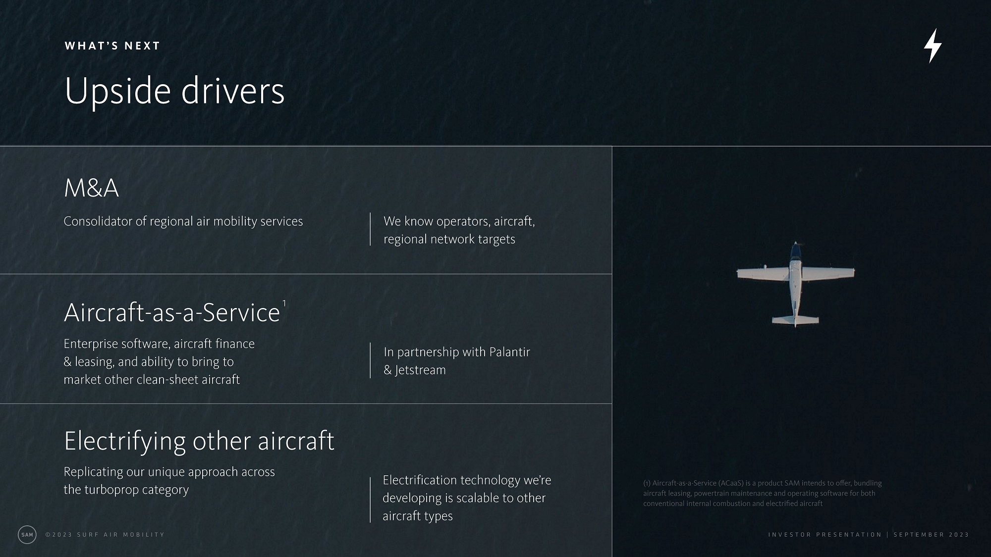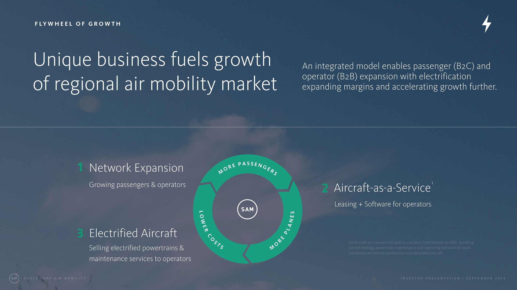 © 2 0 2 3 S U R F A I R M O B I L I T Y I N V E S T O R P R E S E N T A T I O N | S E P T E M B E R 2 0 2 3 F L Y WHEE L O F G R O W T H (1) Aircraft - as - a - Service (ACaaS) is a product SAM intends to offer, bundling aircraft leasing, powertrain maintenance and operating software for both conventional internal combustion and electrified aircraft U ni q ue business f uels gro w th o f r egional air mobility ma r k et An in tegr a t ed model enables passenger (B2C) and oper a tor (B2B) e xpansion with elec trifi c a tion expanding margins and accelerating growth further. 2 A i r craf t - a s - a - Se r vic e 1 L easing + S o f t wa r e f or oper a tors 1 Ne t wo r k Expansion G rowing passengers & oper a tors 3 Elec trified A i r craft Se l ling elec trified po w e rtrains & main t enance se r vices to oper a tors