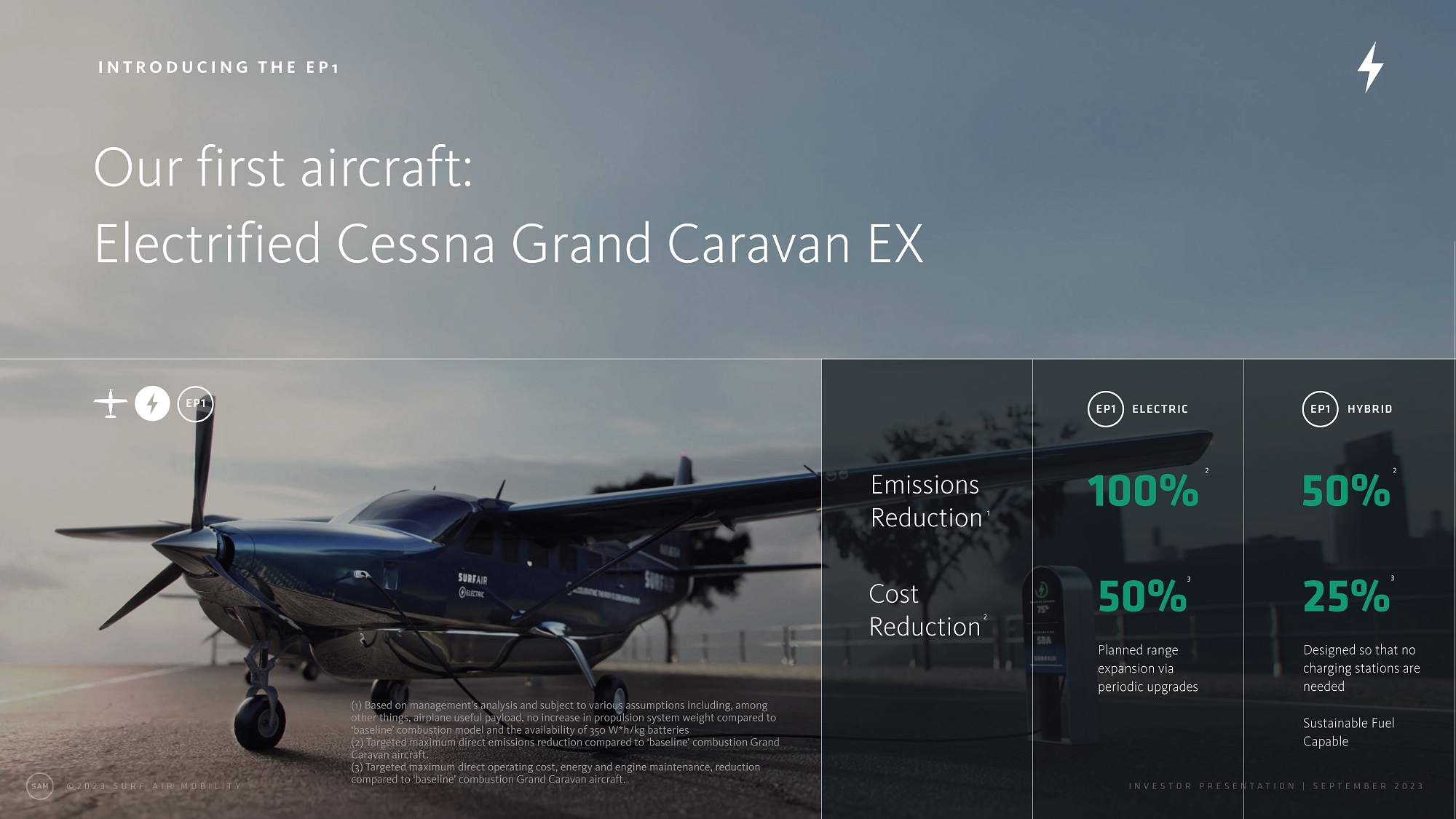 EP1 Planned range e xpansion via periodic upgrades 100% 50% Designed so th a t no char ging s t a tions a r e needed Sus t ainable F uel Capable 50% 25% 2 Cost R edu c tio n 2 Emissions R edu c tion 1 2 3 3 © 2 0 2 3 S U R F A I R M O B I L I T Y INTR ODUCING THE EP1 EP1 ELECTRIC EP1 HYBRID (1) Based on management’s analysis and subject to various assumptions including, among other things, airplane useful payload, no increase in propulsion system weight compared to ‘baseline’ combustion model and the availability of 350 W*h/kg batteries (2) Targeted maximum direct emissions reduction compared to ‘baseline’ combustion Grand Car a van ai rcraf t . (3) Targeted maximum direct operating cost, energy and engine maintenance, reduction c ompar ed to ‘ baselin e ’ c ombustion G rand Car a van ai rcraf t . I N V E S T O R P R E S E N T A T I O N | S E P T E M B E R 2 0 2 3 Our first ai r craft: Ele c trified C essna G rand Car a van EX