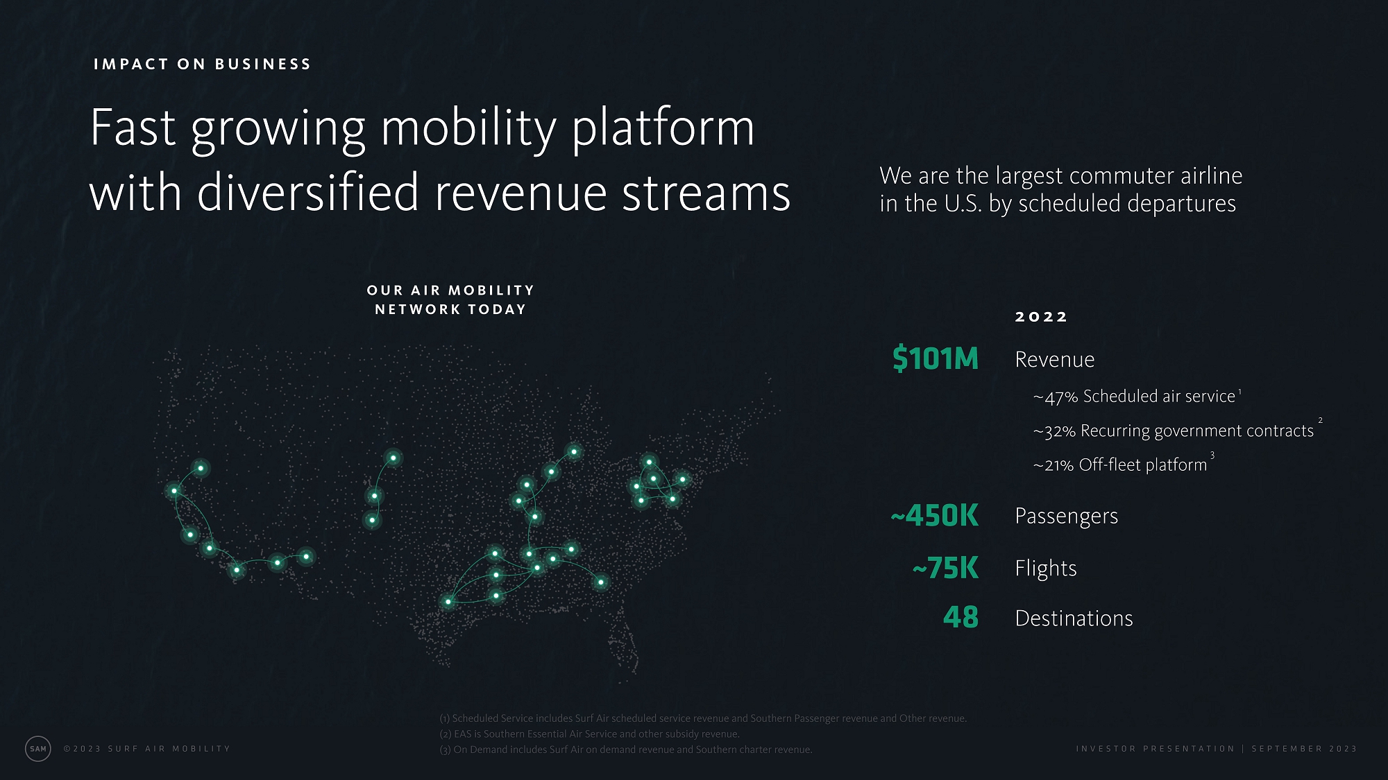 $ 101M P assengers ~ 4 50K ~75K 48 Flights Destin a tions F ast growing mobility pl at f orm with di v ersified r e v enue st r eams I M P A C T O N B U SIN E S S (1) Scheduled Service includes Surf Air scheduled service revenue and Southern Passenger revenue and Other revenue. (2) EAS is Southern Essential Air Service and other subsidy revenue. (3) On Demand includes Surf Air on demand revenue and Southern charter revenue. I N V E S T O R P R E S E N T A T I O N | S E P T E M B E R 2 0 2 3 O U R A I R M O B I L I T Y NE T W OR K T O D A Y © 2 0 2 3 S U R F A I R M O B I L I T Y W e a r e the la r gest c ommu t er airline in the U .S. by scheduled depa r t u r es 2 0 2 2 Revenue ~47% Scheduled air se r vice 1 ~ 3 2 % Recurring g o v ernment c ontra c ts 2 ~ 2 1% Of f - fleet pl at f orm 3