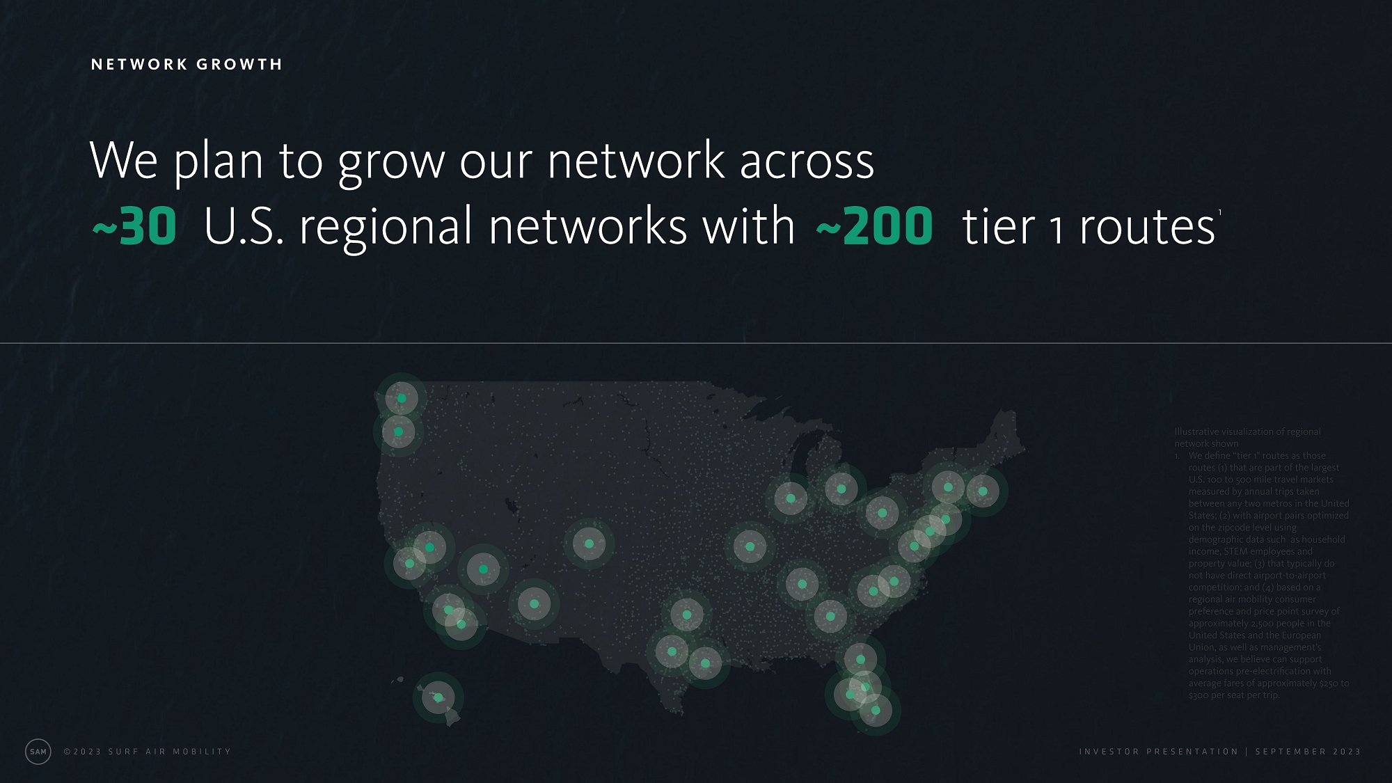 Illustrative visualization of regional ne t wo r k shown 1. W e d e fi ne “ tier 1 " rou t es as those rou t es (1) th a t a r e pa r t o f the la r gest U .S. 100 to 5 00 mile tr a v el ma r k ets measur ed by annual trips t a k en be t w een a n y t wo metros in the U ni t ed S t a t es; (2) with airpo r t pairs optimi z ed on the zip c ode le v el using demographic data such as household in c ome, STEM empl o yees and property value; (3) that typically do not h a v e di r e ct airpo r t - to - airpo r t c ompetition; and (4) based on a r egional air mobility c onsumer p r e f e r ence and price point su r v ey o f approximately 2,500 people in the U ni ted S t a t es and the E uropean U nion, as w e l l as mana gement ’ s analysis, we belie ve c an suppo r t operations pre - electrification with a v er a ge f a r es o f appr o xim a t ely $ 2 5 0 to $300 per se at per tri p . NE T W OR K G R O W T H © 2 0 2 3 S U R F A I R M O B I L I T Y I N V E S T O R P R E S E N T A T I O N | S E P T E M B E R 2 0 2 3 We plan to grow our network across ~30 U .S. r egional ne t wo r ks with ~200 tier 1 rou t e s 1