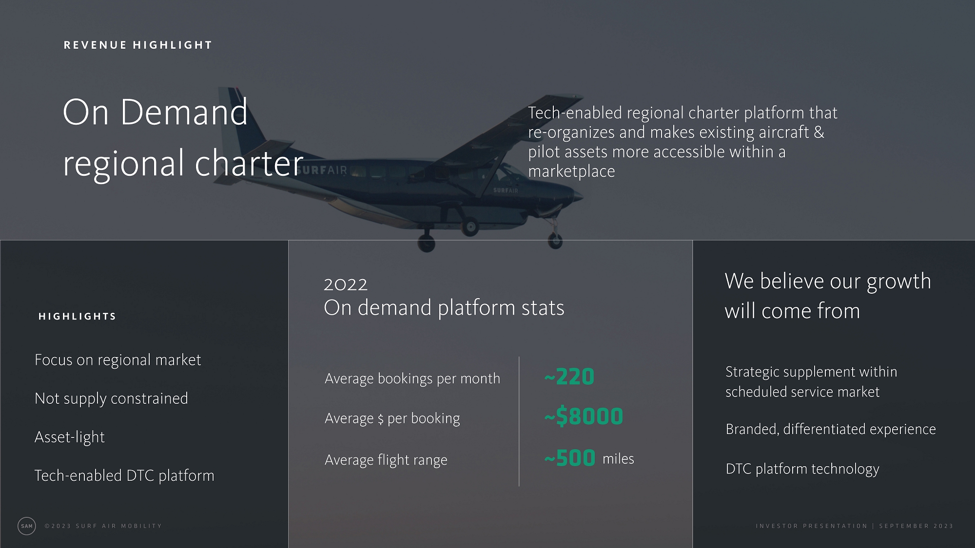 © 2 0 2 3 S U R F A I R M O B I L I T Y I N V E S T O R P R E S E N T A T I O N | S E P T E M B E R 2 0 2 3 2022 On demand pl at f orm s t a ts W e belie ve our gro w th wi l l c ome f rom A v er a ge bookings per month A v er a ge $ per booking A v er a ge flight range ~220 ~$8000 ~500 miles Str a t egic supplement within scheduled se r vice ma r k et Branded, dif f e r enti a t ed e xperience D T C pl a t f orm t echnolo g y I N V E S T O R P R E S E N T A T I O N | S E P T E M B E R 2 0 2 3 F ocus on r egional ma r k et HIGHLIGHTS REVENUE HIGHLIGHT On Demand r egional cha r t er T ech - enabled r egional cha r t er pl a t f orm th a t re - organizes and makes existing aircraft & pilot assets mo r e accessible within a marketplace Asset - light T ech - enabled D T C pl a t f orm Not supply c onstrained © 2 0 2 3 S U R F A I R M O B I L I T Y