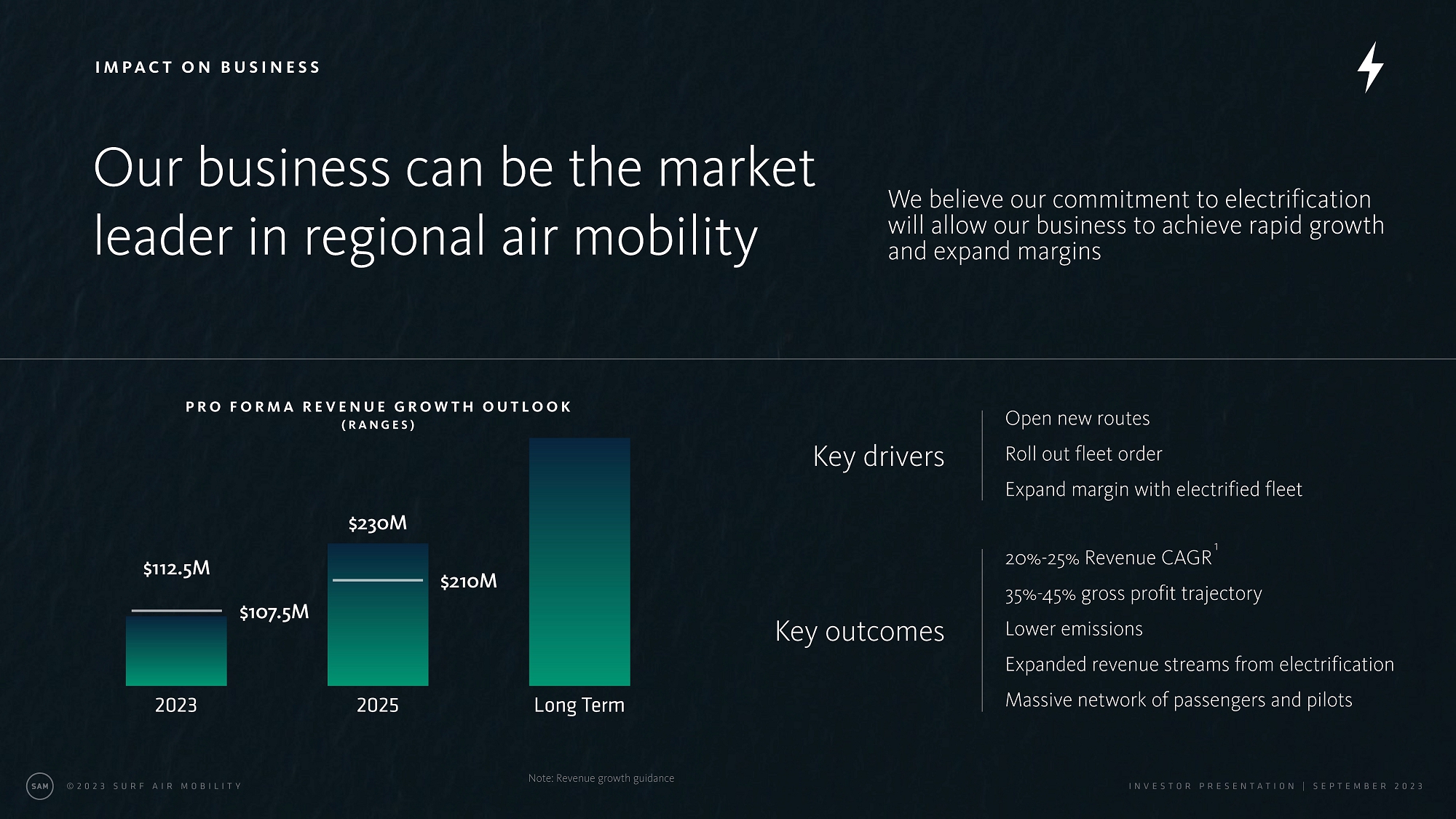 © 2 0 2 3 S U R F A I R M O B I L I T Y I N V E S T O R P R E S E N T A T I O N | S E P T E M B E R 2 0 2 3 Key dri v ers Open new rou t es R o l l out fleet order Expand margin with electrified fleet Key ou t c omes 2 0 2 3 2 0 25 L ong T erm $1 0 7 .5M I M P A C T O N B U SIN E S S P R O F ORM A REVENU E G R O W T H O UT L OO K (RANG E S ) $ 2 10M No t e: R ev enue gro w th g uidance $ 2 30M $112.5M 20% - 2 5% R e v enue C A G R 1 35% - 4 5% gross pr o fit traje c to r y L o w er emissions Expanded r e v enue st r eams f rom elec trifi c a tion Massi v e ne t wo r k o f passengers and pilots Our business c an be the ma r k et leader in r egional air mobility W e belie ve our c ommitment to elec trifi c a tion will allow our business to achieve rapid growth and e xpand ma r gins