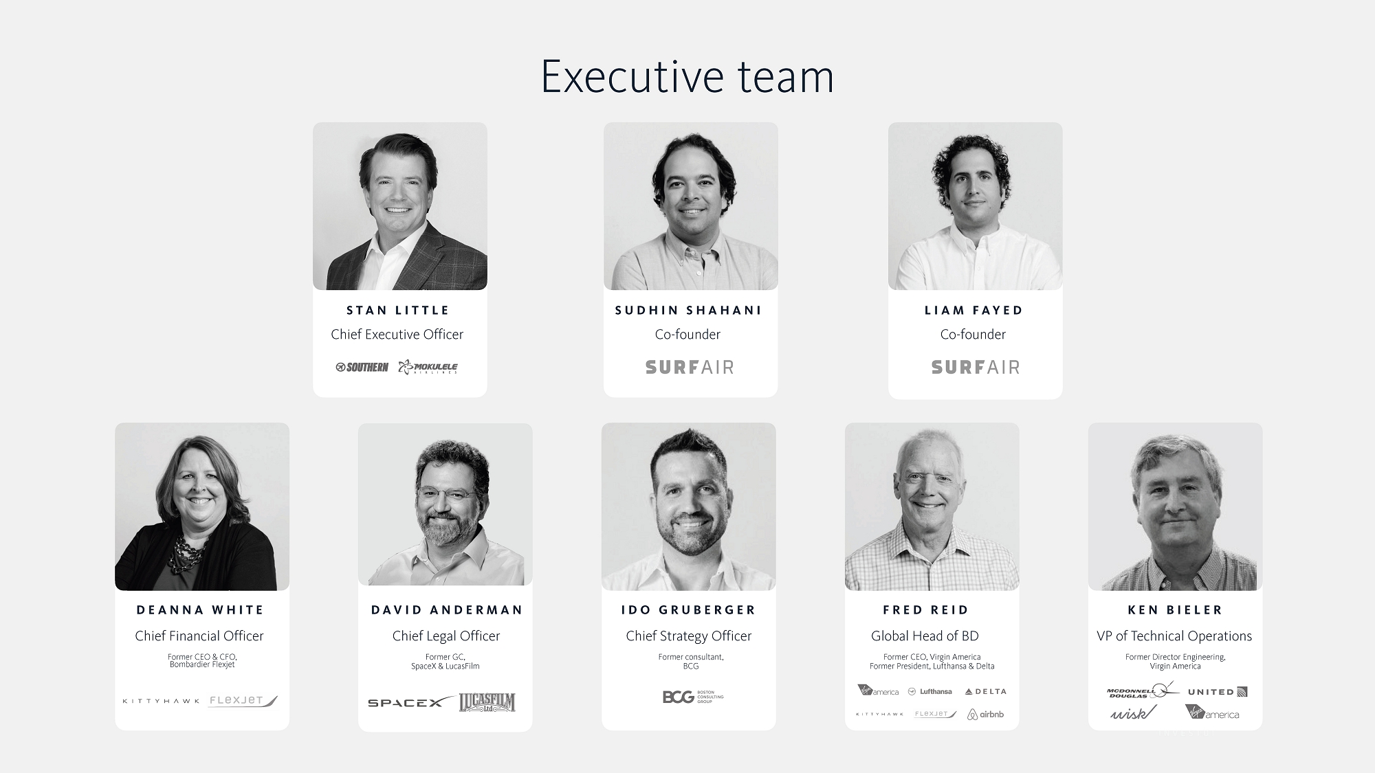 S U R F A I R M O B I L I T Y | © 2 0 2 3 S U R F A I R M O B I L I T Y I N V E S T O R D A Y | J U N E 2 0 2 3 E x ecuti v e t eam SU D H I N S H A H A N I Co - founder LIA M F A YE D Co - founder ST AN LIT TLE Chi e f E x ecuti v e Officer DEANNA WHITE Chi e f F inancial Officer F ormer CEO & C F O , Bombardier Fl e xjet D A V I D A N D E R M A N Chi e f L egal Officer F ormer GC, SpaceX & L ucas F ilm ID O G R UBE R GE R Chi e f Str a t e g y Officer F ormer c onsul t an t , BCG FRED REID Global Head o f BD F ormer CE O , V i r gin Americ a F ormer P r esiden t , L ufthans a & Del t a KEN BIELER VP o f T echni c al Oper a tions F ormer D i r ec tor E ngineerin g , V i r gin Americ a