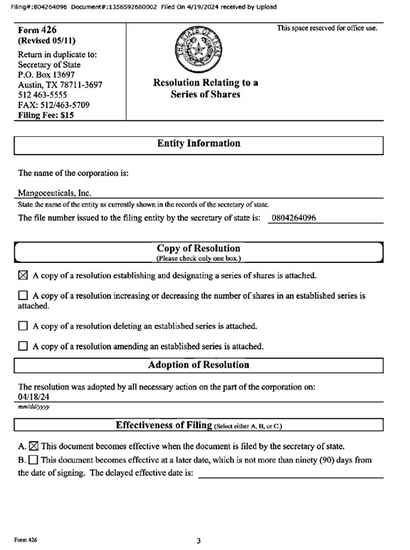 Pursuant to Section 21.155 of the Texas Business Organizations Code (the “TBOC”), Mangoceuticals, Inc., a corporation organized and existing under the TBOC (the “Company”),