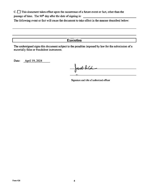 DOES HEREBY CERTIFY that pursuant to the authority conferred upon the Board of Directors by the Certificate of Formation of the Company, as amended (the “Certificate of Formation”), and pursuant to Section 21.155 of the TBOC, the Board of Directors, pursuant to Section 6.201 of the TBOC, by unanimous consent of all members of the Board of Directors on April 18, 2024, duly adopted a resolution providing for the designation of a series of Six Million Two Hundred and Fifty Thousand (6,250,000) shares of Series C Convertible Preferred Stock, which resolution is and reads as follows: