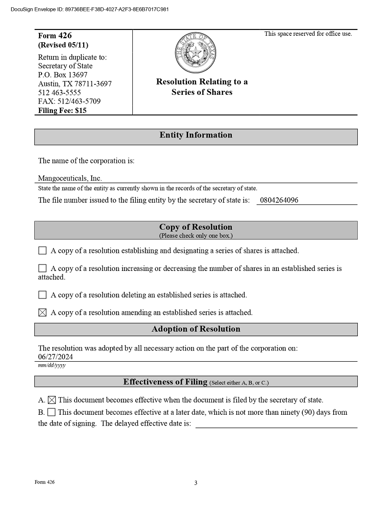Mangoceuticals, Inc., a Texas corporation (the “Company”), hereby certifies that the following resolution was adopted by (a) the Board of Directors of the Company (the “Board of Directors”); and (b) the sole shareholder of the Company’s outstanding Series B Convertible Preferred Stock (the “Majority Stockholder”), pursuant to Sections 21.155 and 21.364(g) of the Texas Business Organizations Code.